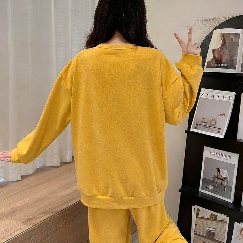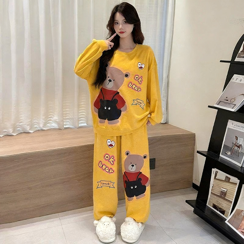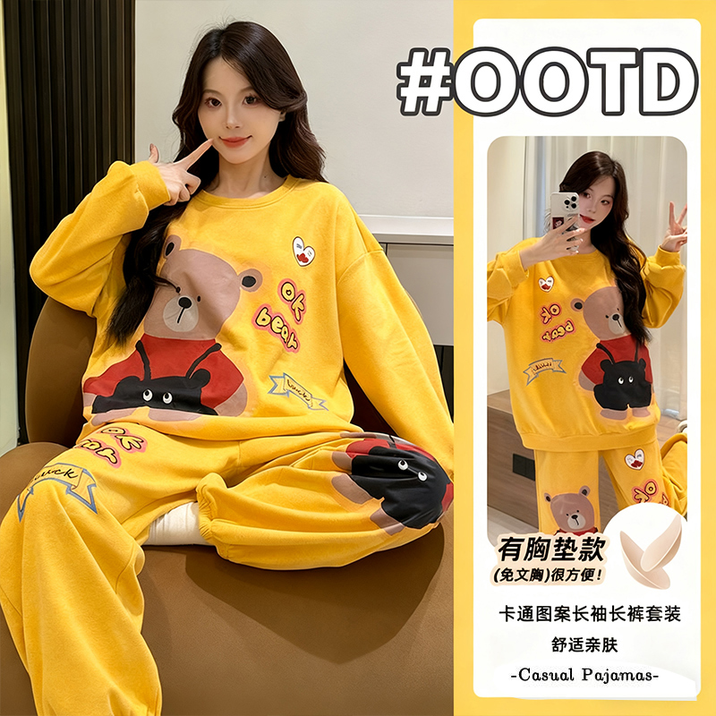 两件套家居服套装 带胸垫睡衣女款 长裤 棕熊卡通印花长袖 外穿 春秋季
