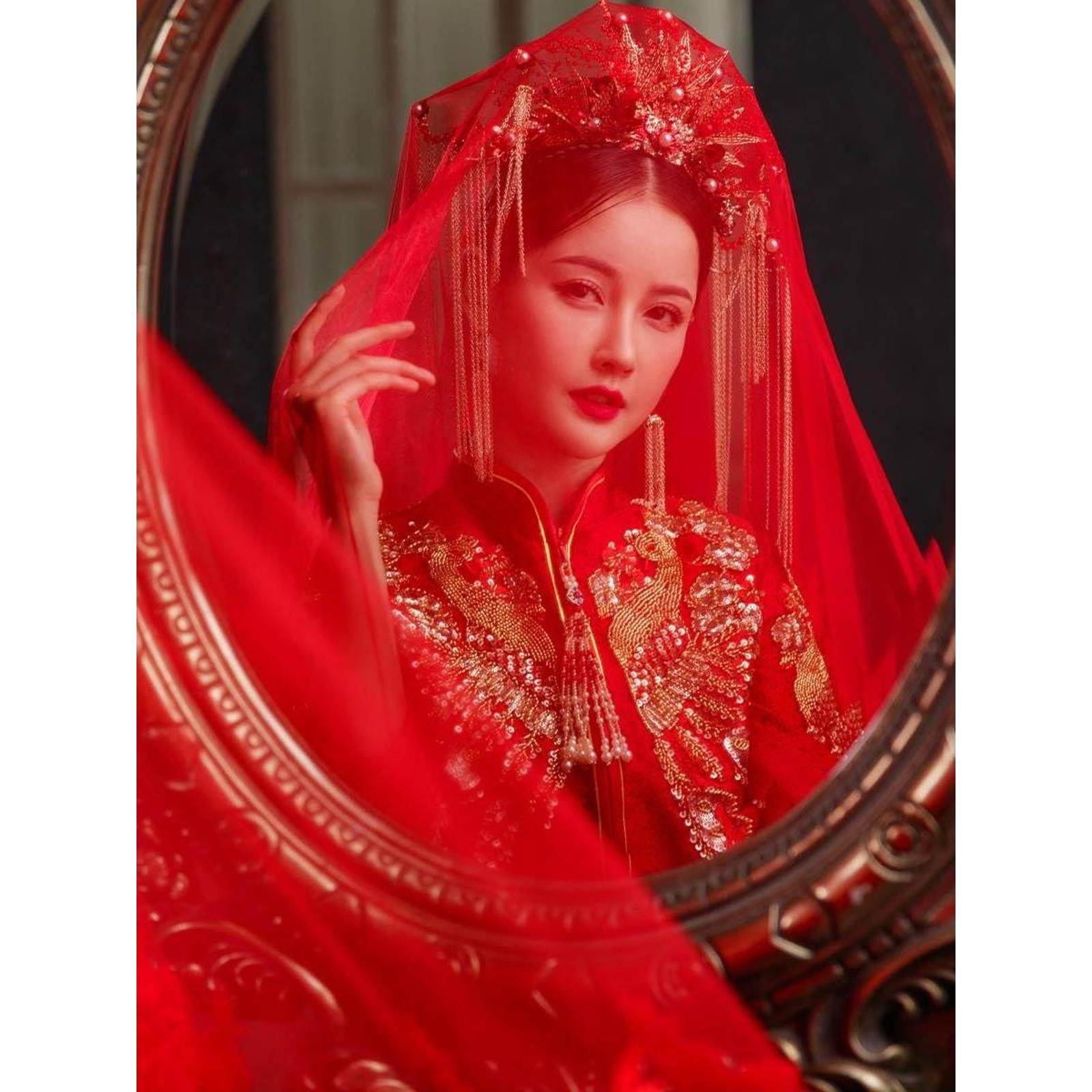 蕾丝中式 半透明红盖头新娘头纱秀禾服古风刺绣出嫁婚礼高级感求婚