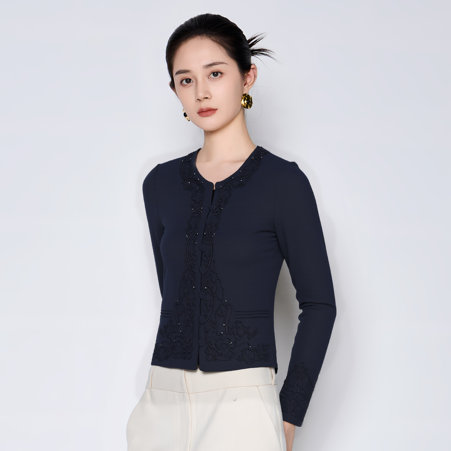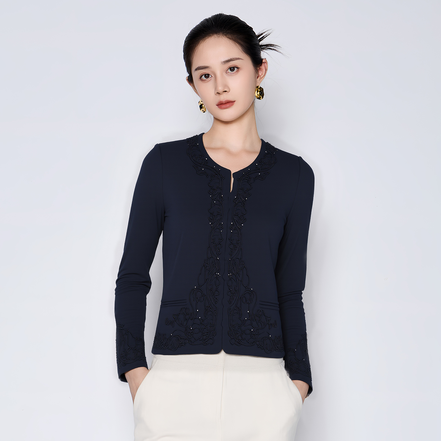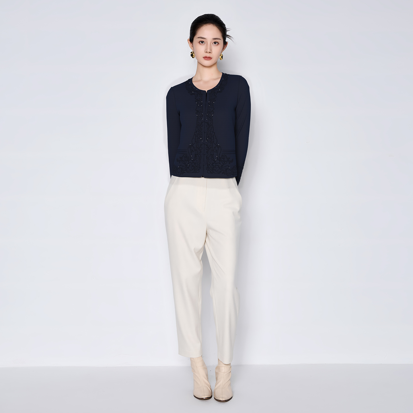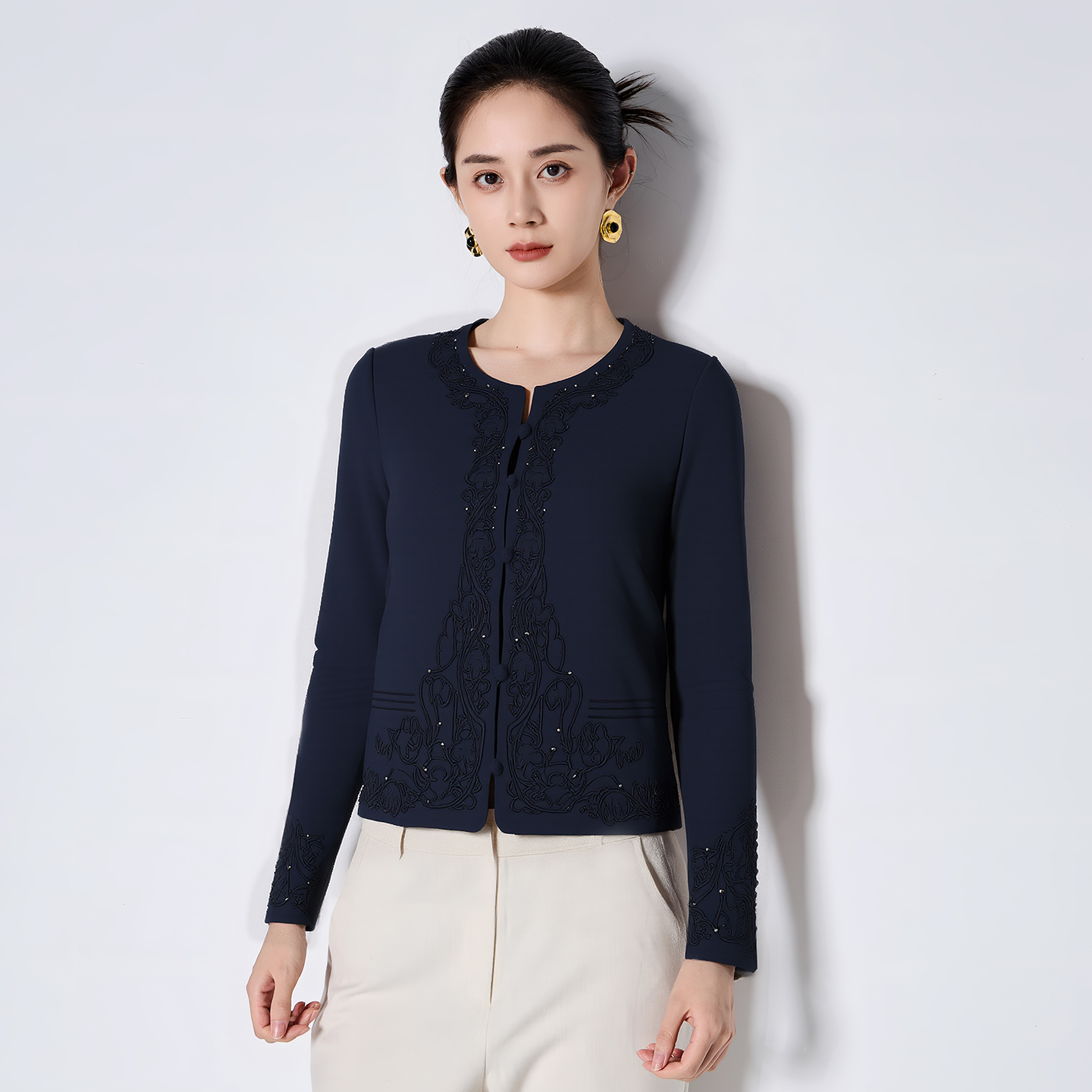 气质法式 马天奴2025秋冬新款 时尚 外套短款 女 藏青棉麻刺绣圆领修身