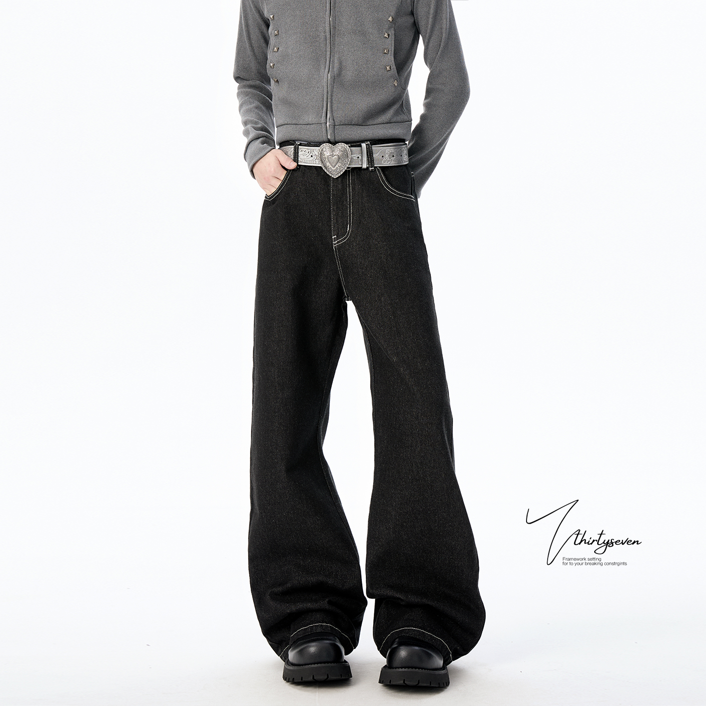 潮牌cleanfit显瘦微喇裤 男秋季 子 高街复古丹宁原色牛仔裤 V37美式