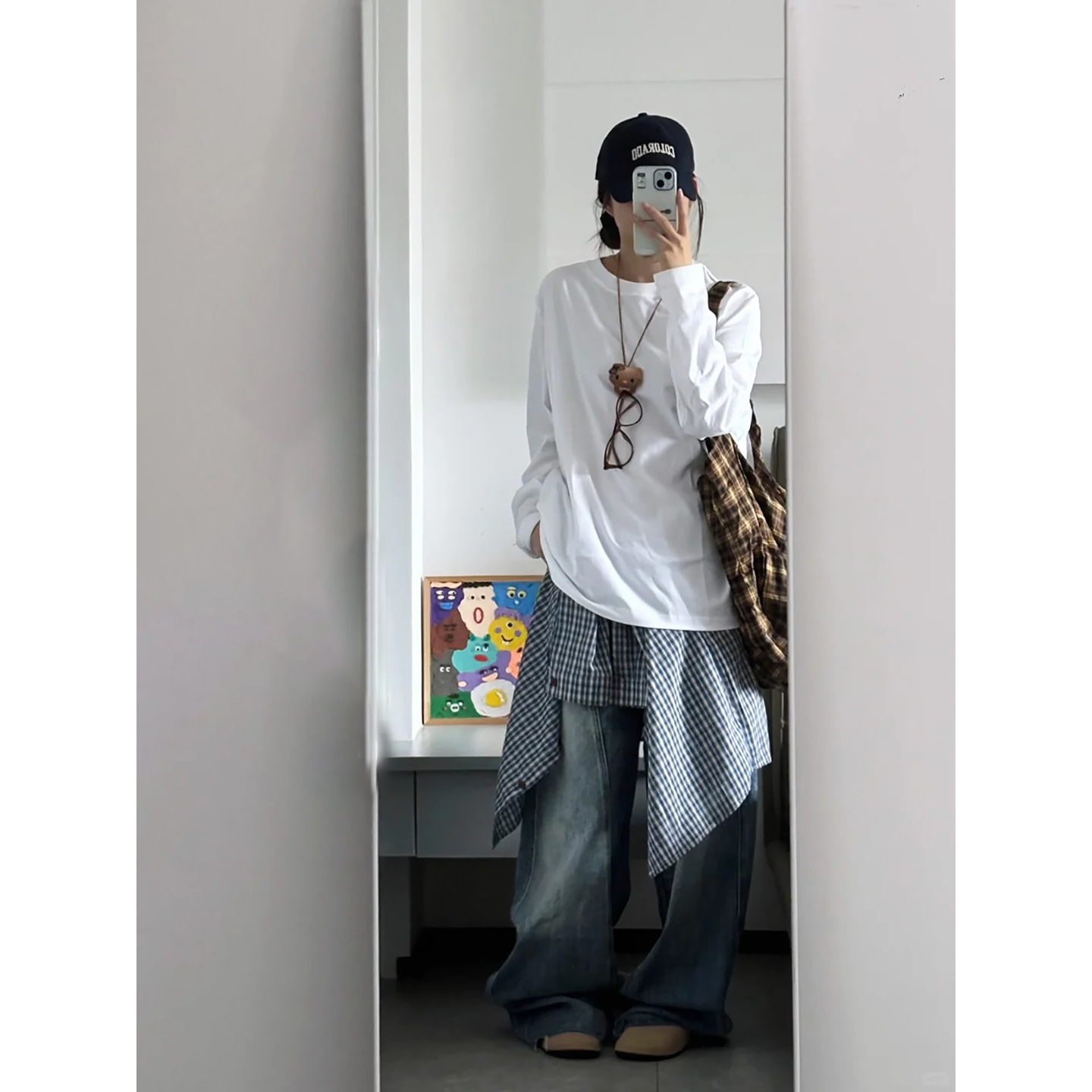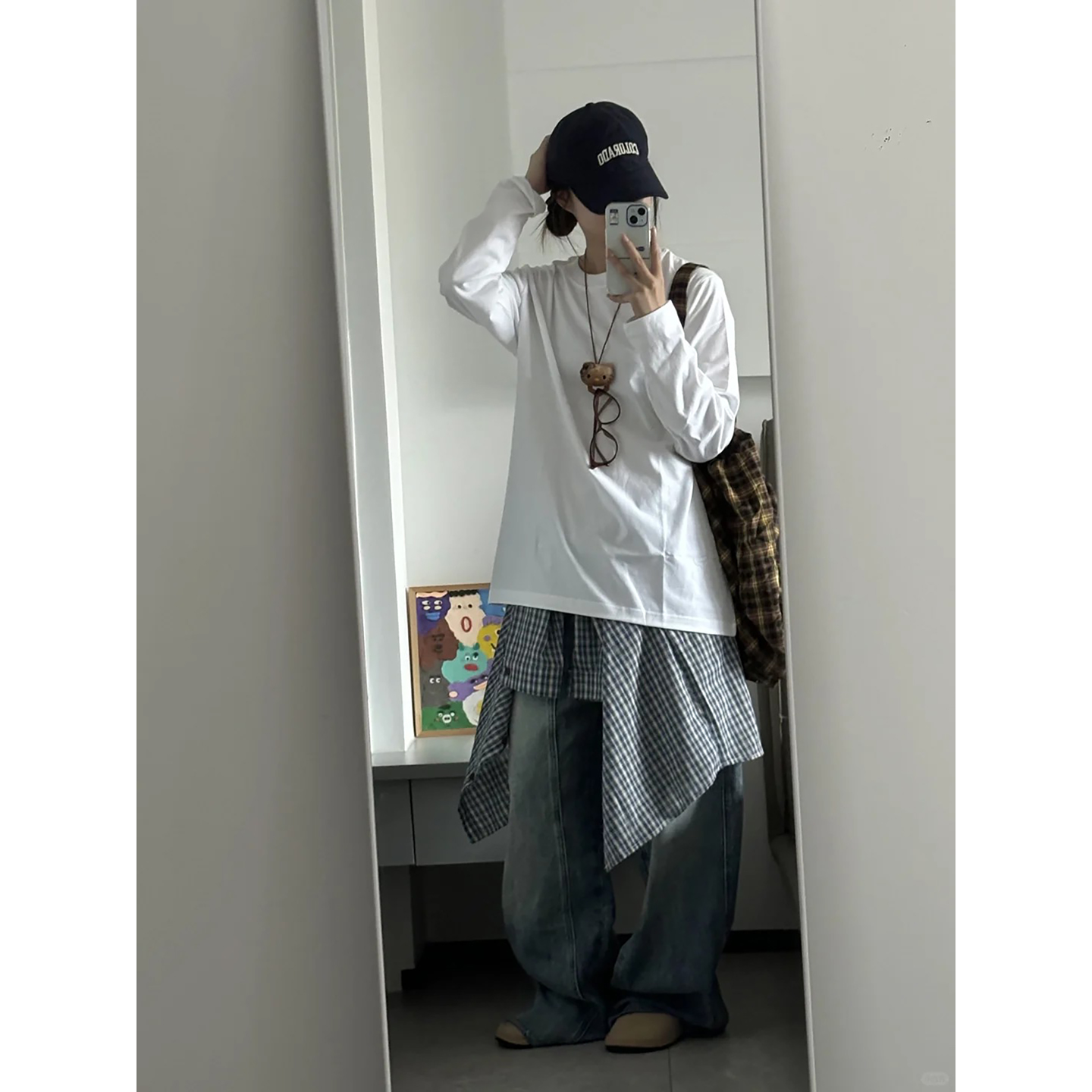 简约圆领内搭打底衫 t恤男秋季 小领口落肩上衣 纯白色长袖 重磅美式