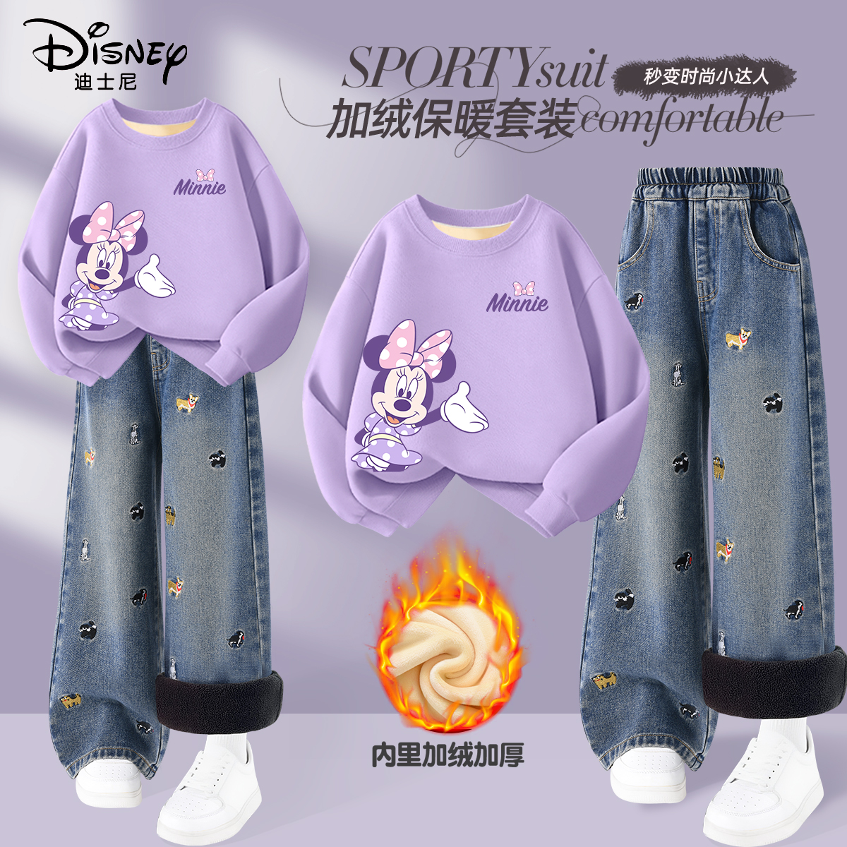 女孩衣服冬装 加绒中大童一体绒牛仔裤 女童2025新款 迪士尼儿童套装