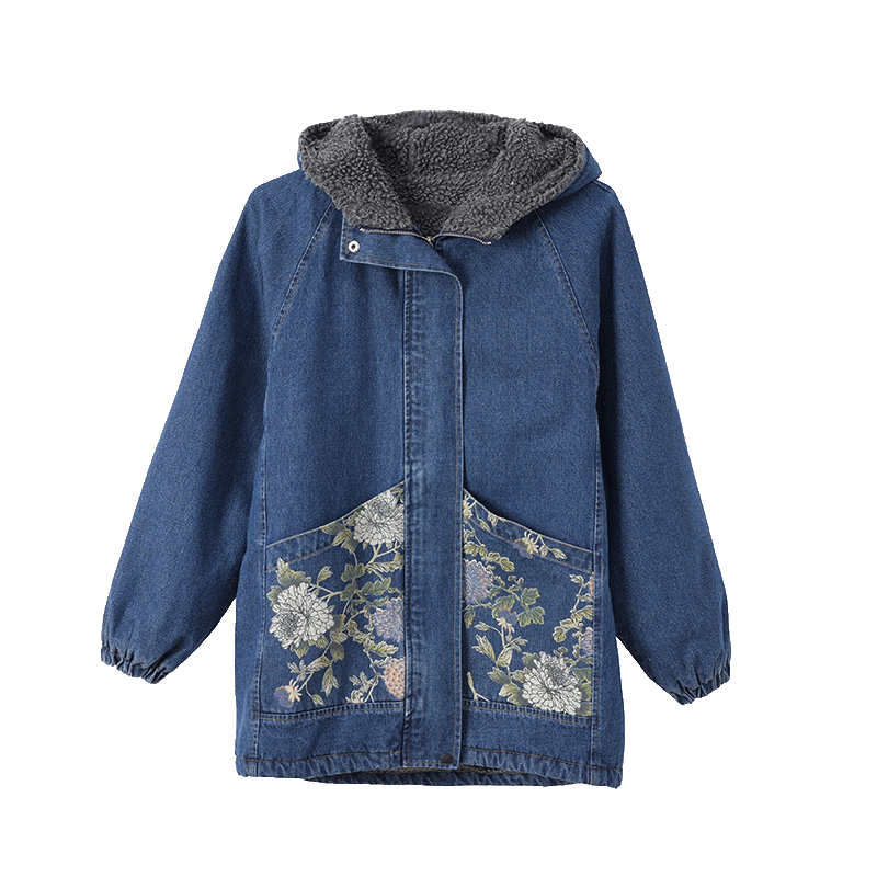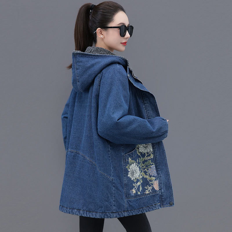 加绒加厚大口袋牛仔外套女2025秋冬新款 学生羊羔毛民族风刺绣棉服