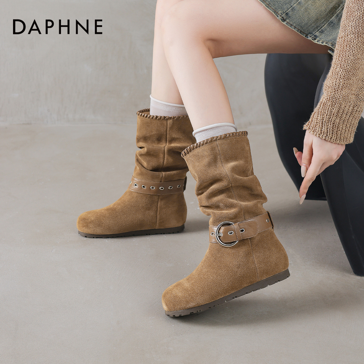达芙妮棕色中筒靴女2025秋冬新款 真皮内增高西部靴勃肯短靴堆堆靴