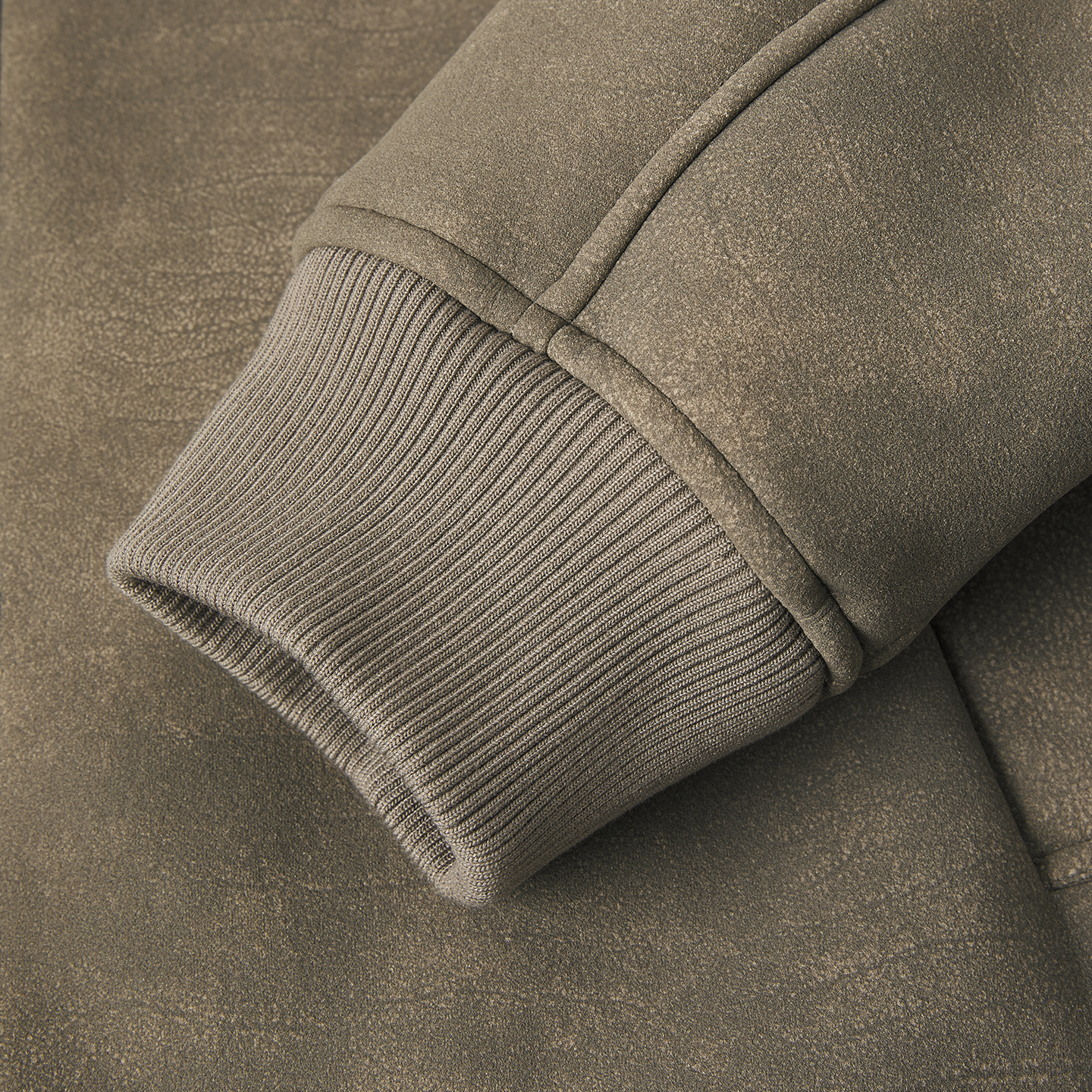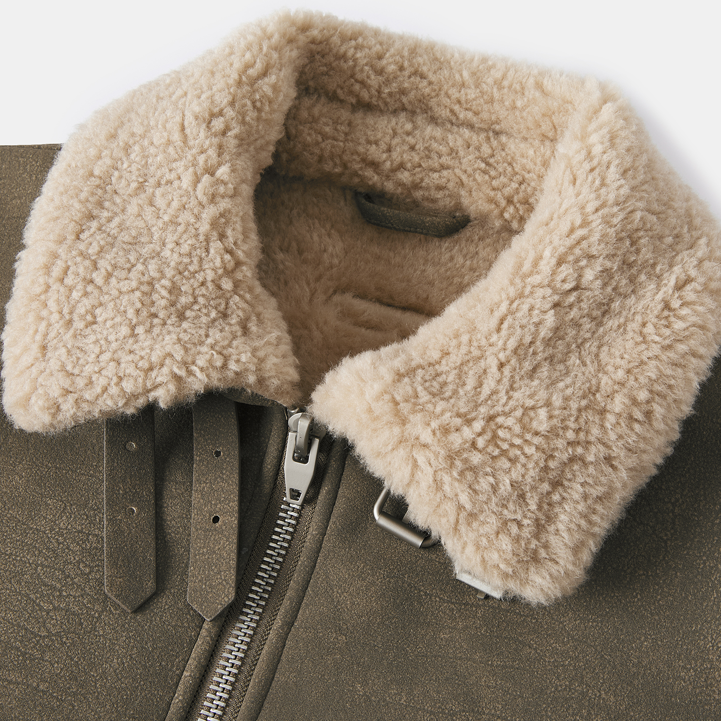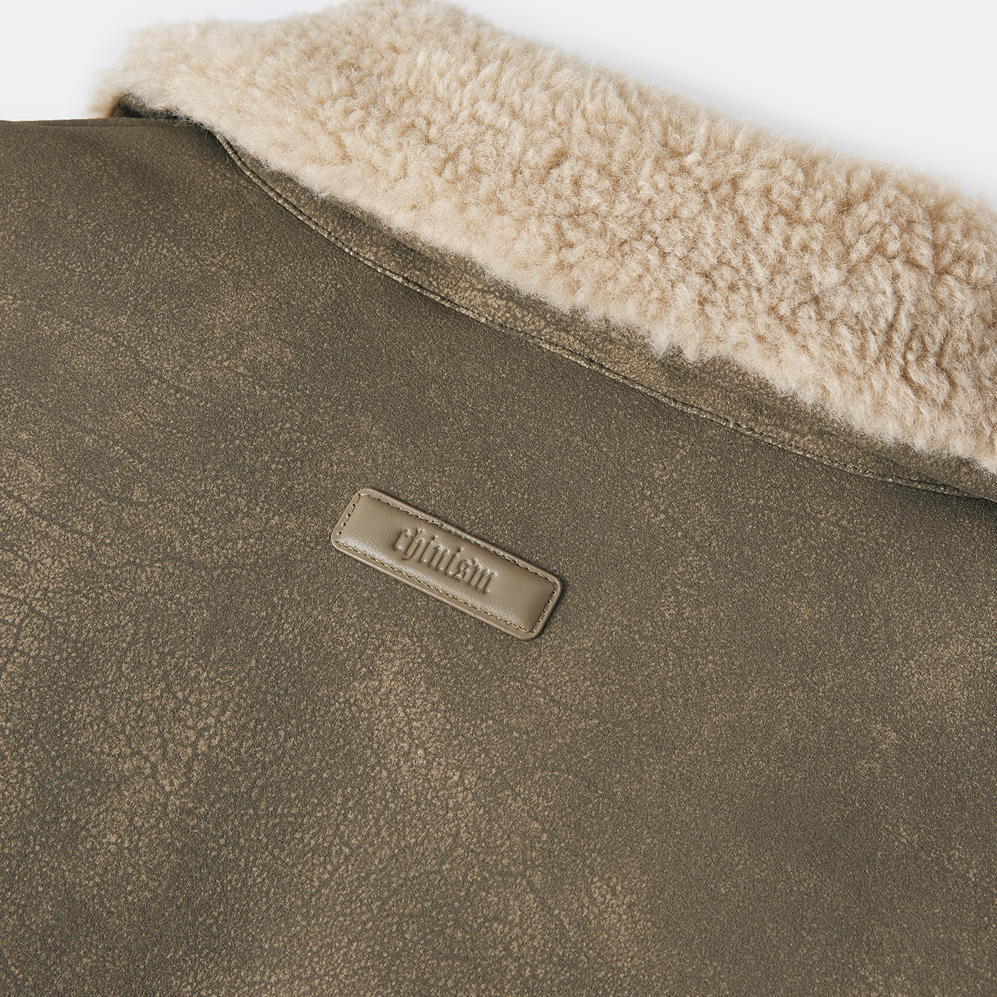 510464 复古拼接皮翻领松紧下摆宽松夹克女装 三福外套2025新款 冬季