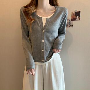 蓝色毛衣外套 上衣灰色圆领全棉线薄款 纯棉bm针织开衫 女早秋长袖