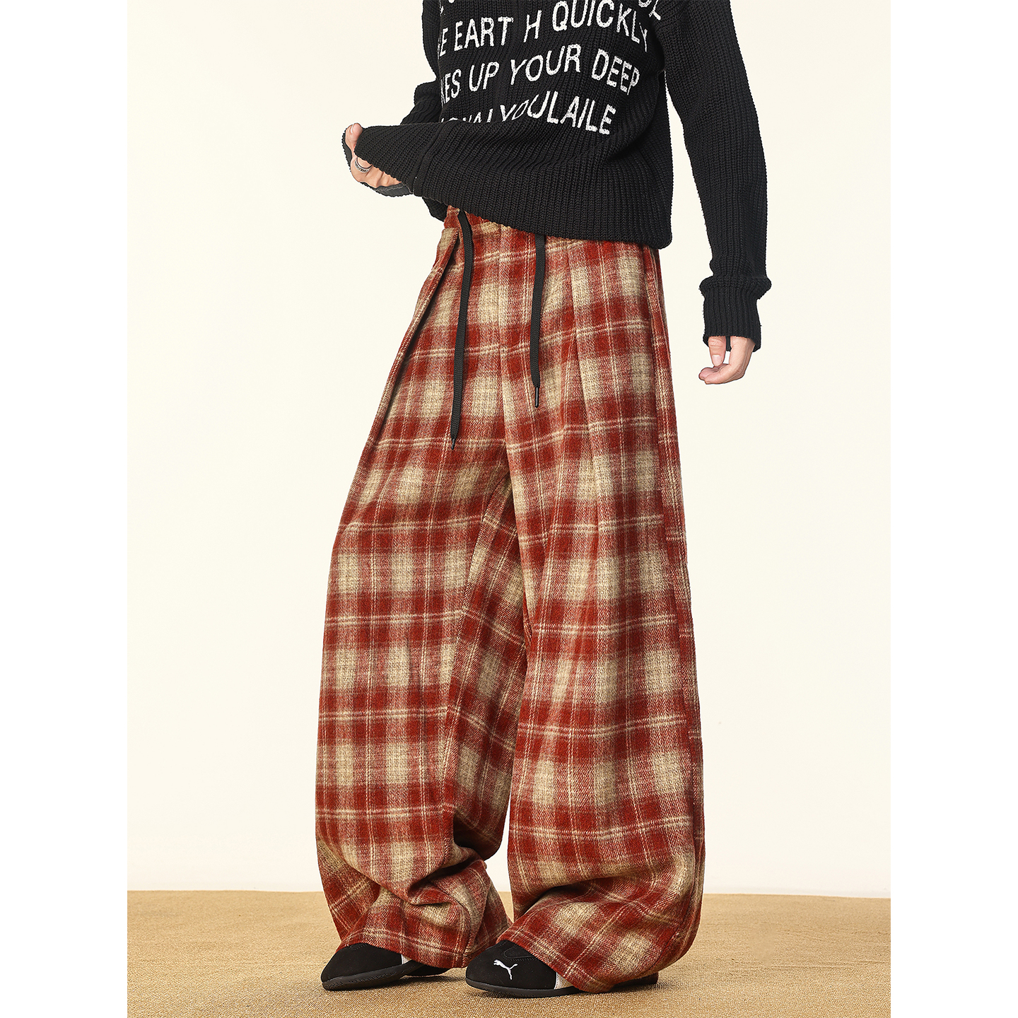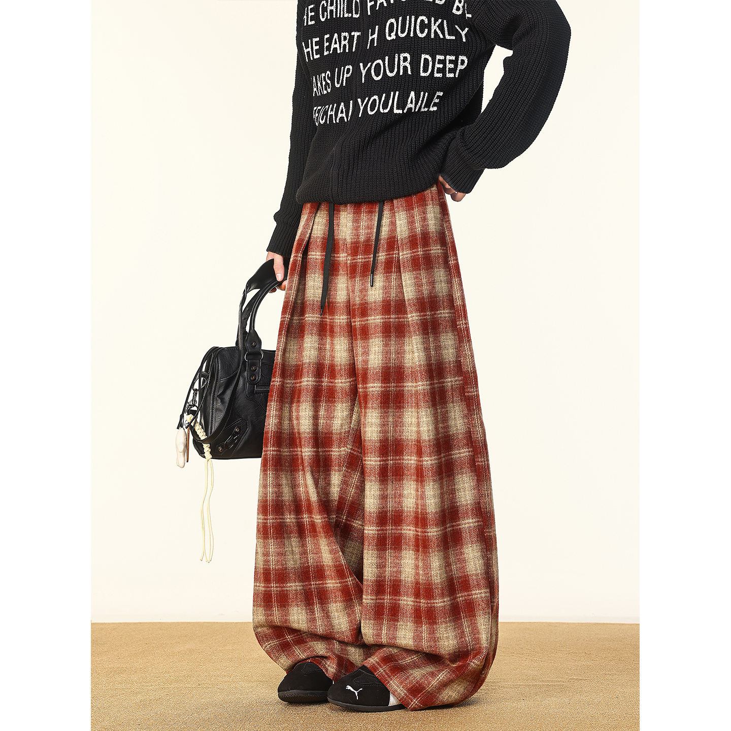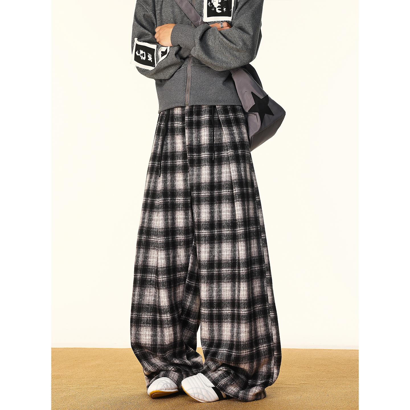 潮牌宽松阔腿情侣弯刀长裤 美式 新款 子男生秋季 撞色磨毛格子休闲裤