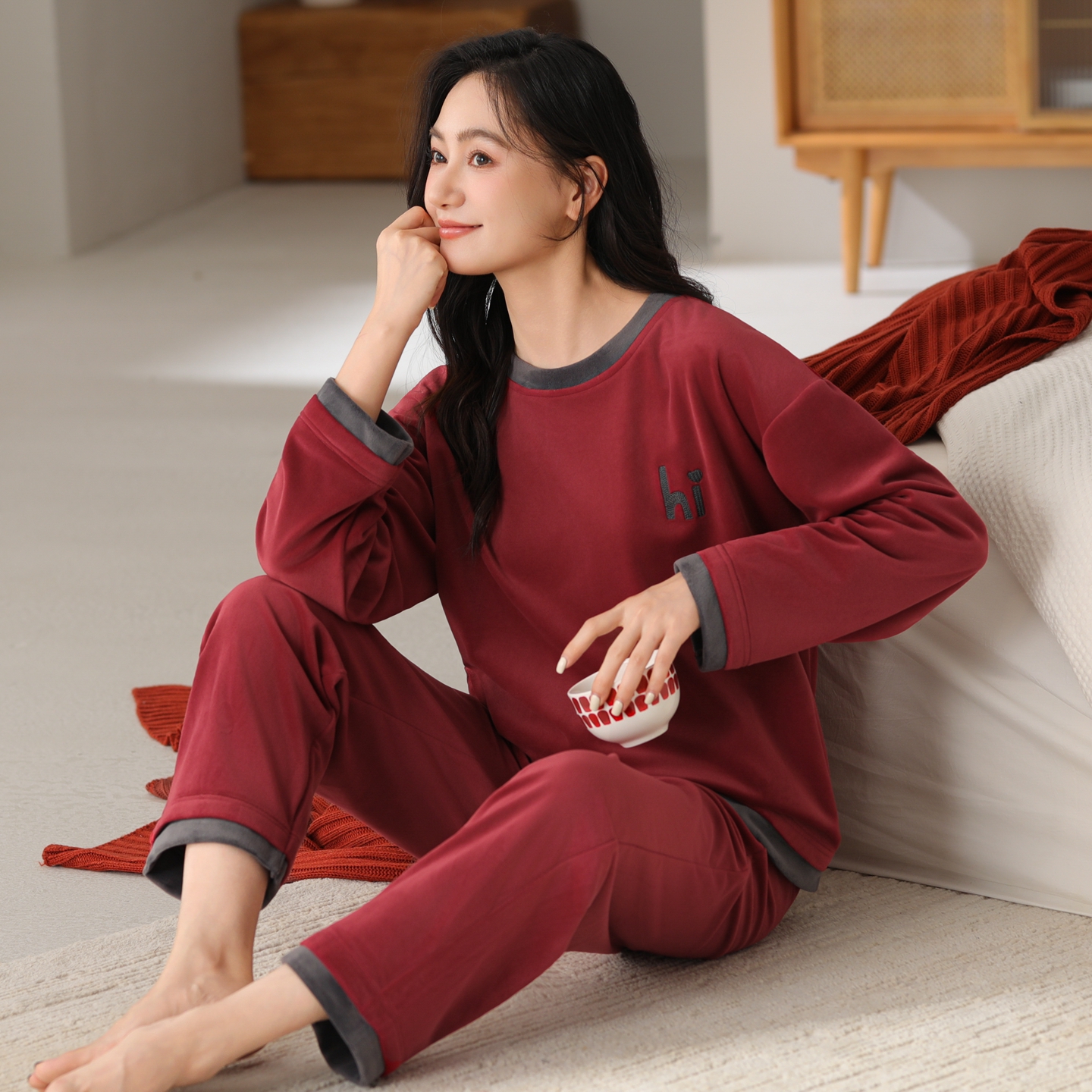 家居服薄绒珊瑚绒 秋冬款 睡衣女冬季 加厚海岛绒保暖可外穿圆领长袖