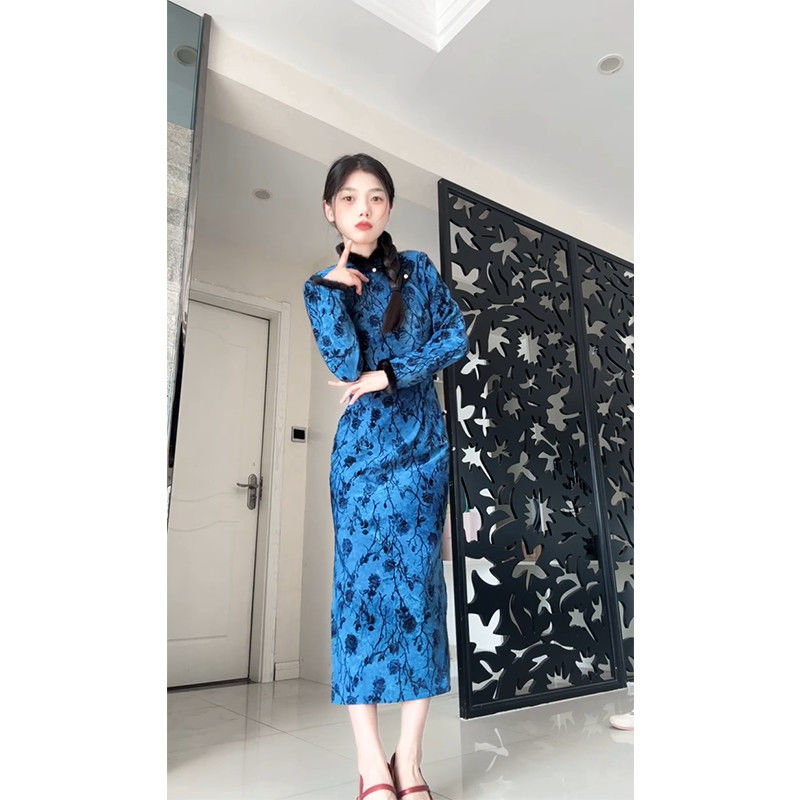 黑色丝绒鱼尾旗袍性感长款 连衣裙女秋 显瘦老上海中国风日常生活装