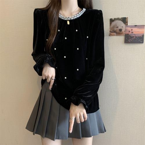胖mm遮肚金丝绒打底衫 大码 上衣1010z t恤女新款 秋冬重工钉珠长袖