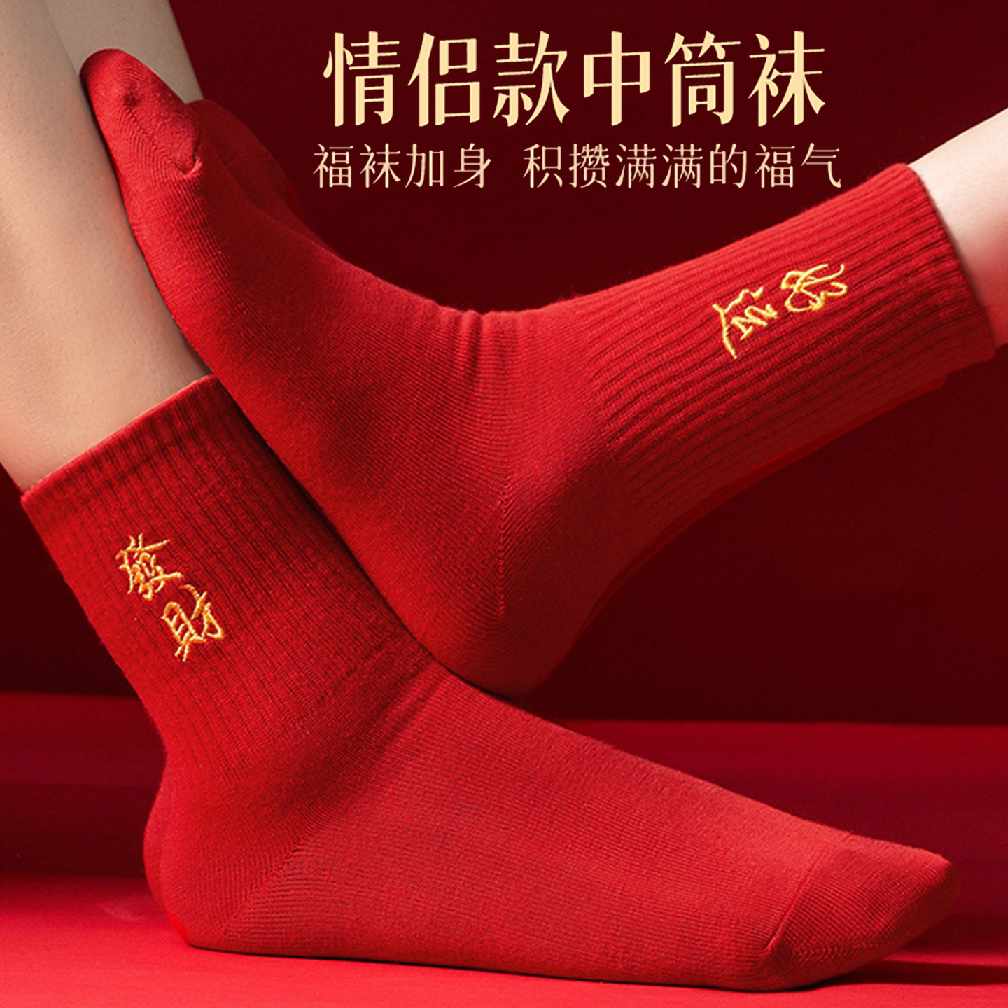 本命年刺绣红色袜子女男秋冬结婚情侣一对中筒袜新年好运大红长袜
