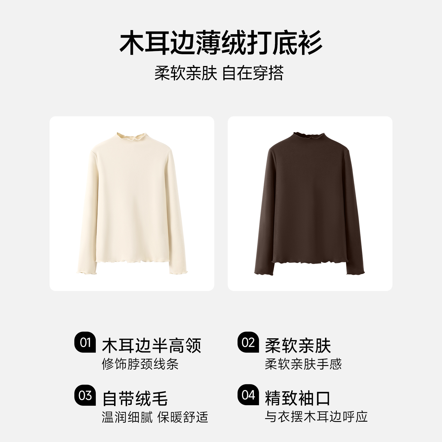 2025秋冬薄绒保暖内搭长袖 班尼路S&K系列木耳边半高领打底衫 女款