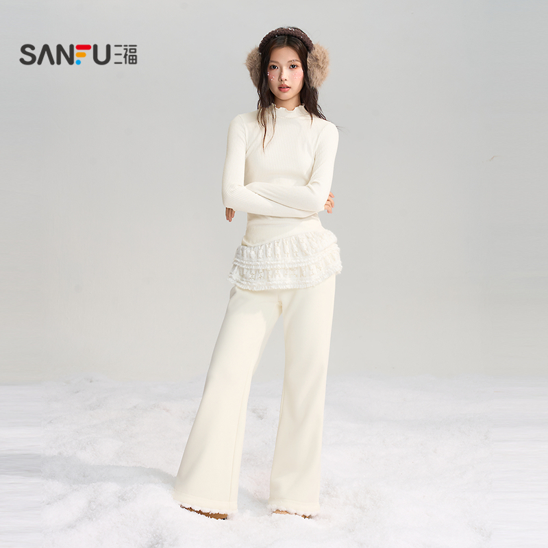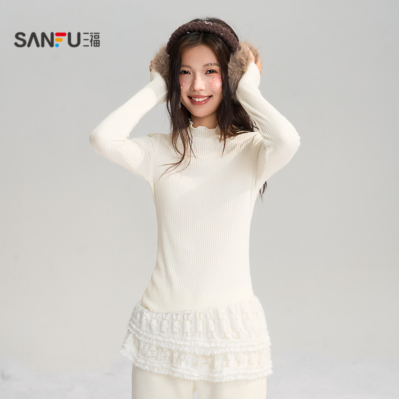 三福长T恤2025冬季 512048 蕾丝花边下摆木耳边高领上衣女装