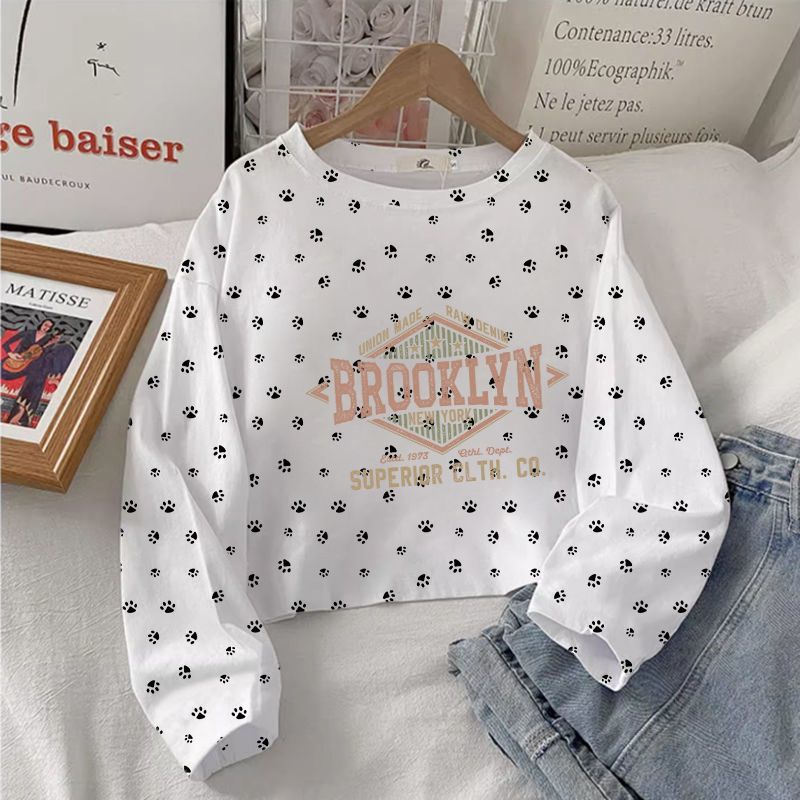 休闲风潮牌宽松显瘦高级感上衣 t恤女士秋季 纯棉短款 脚印白色长袖