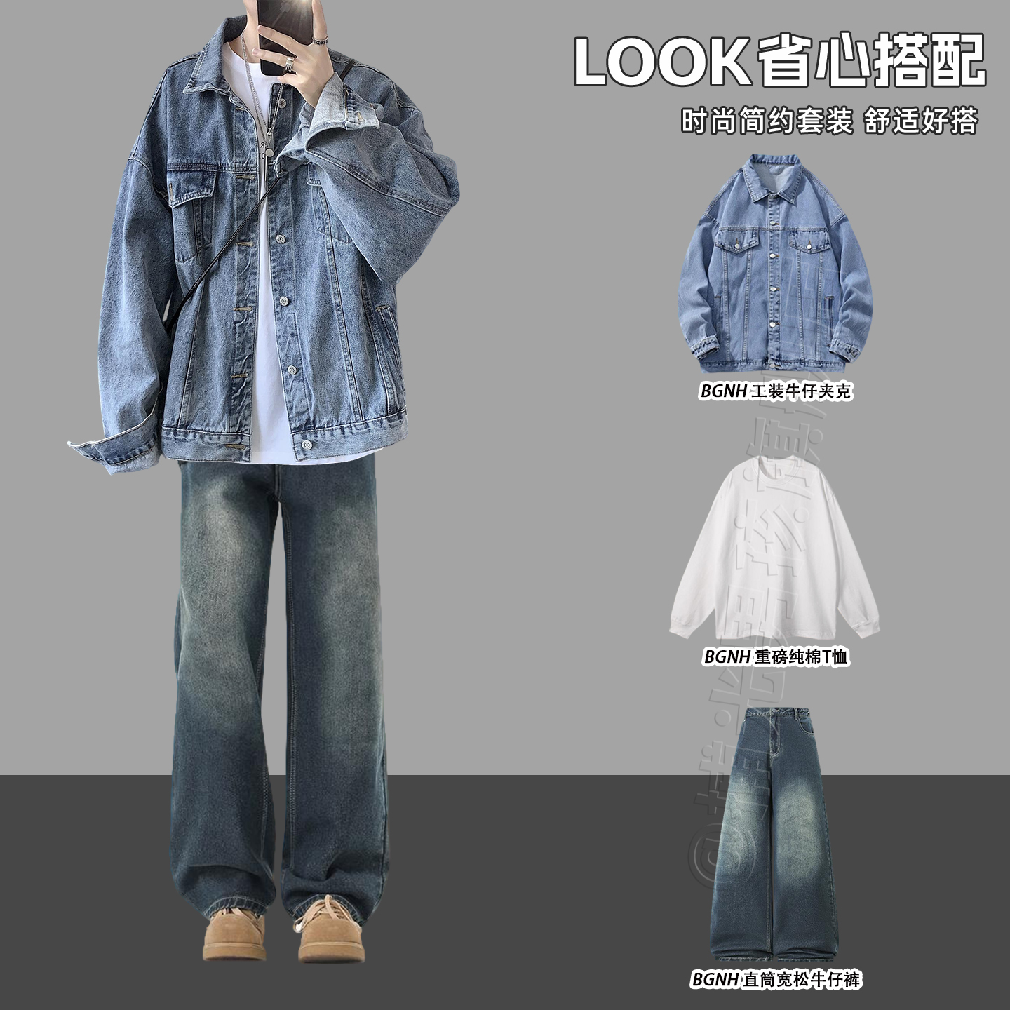 杰克琼斯固色原色牛仔外套 直筒阔型牛仔裤