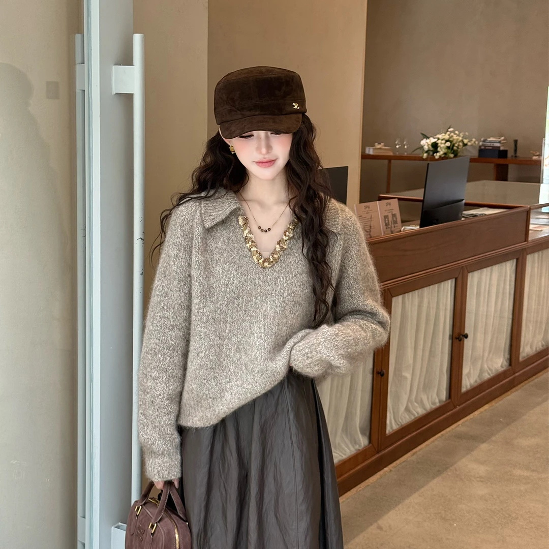老钱风polo领毛衣女慵懒风高级感早秋冬季 V领上衣 外穿气质针织衫