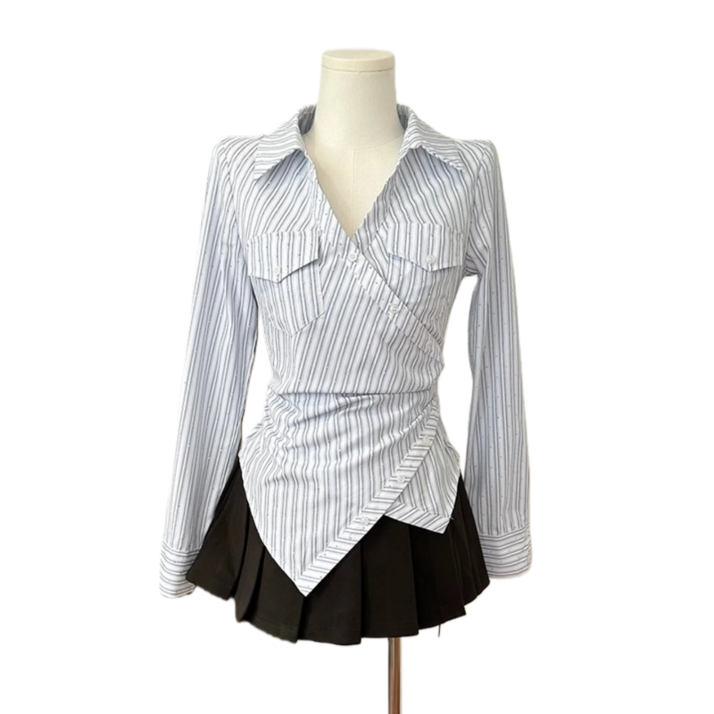 性感百搭百褶短裙两件套女 大码 甜辣风修身 不规则蓝色v领条纹衬衫