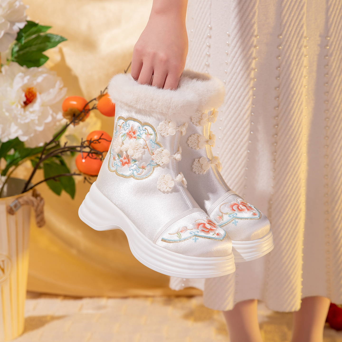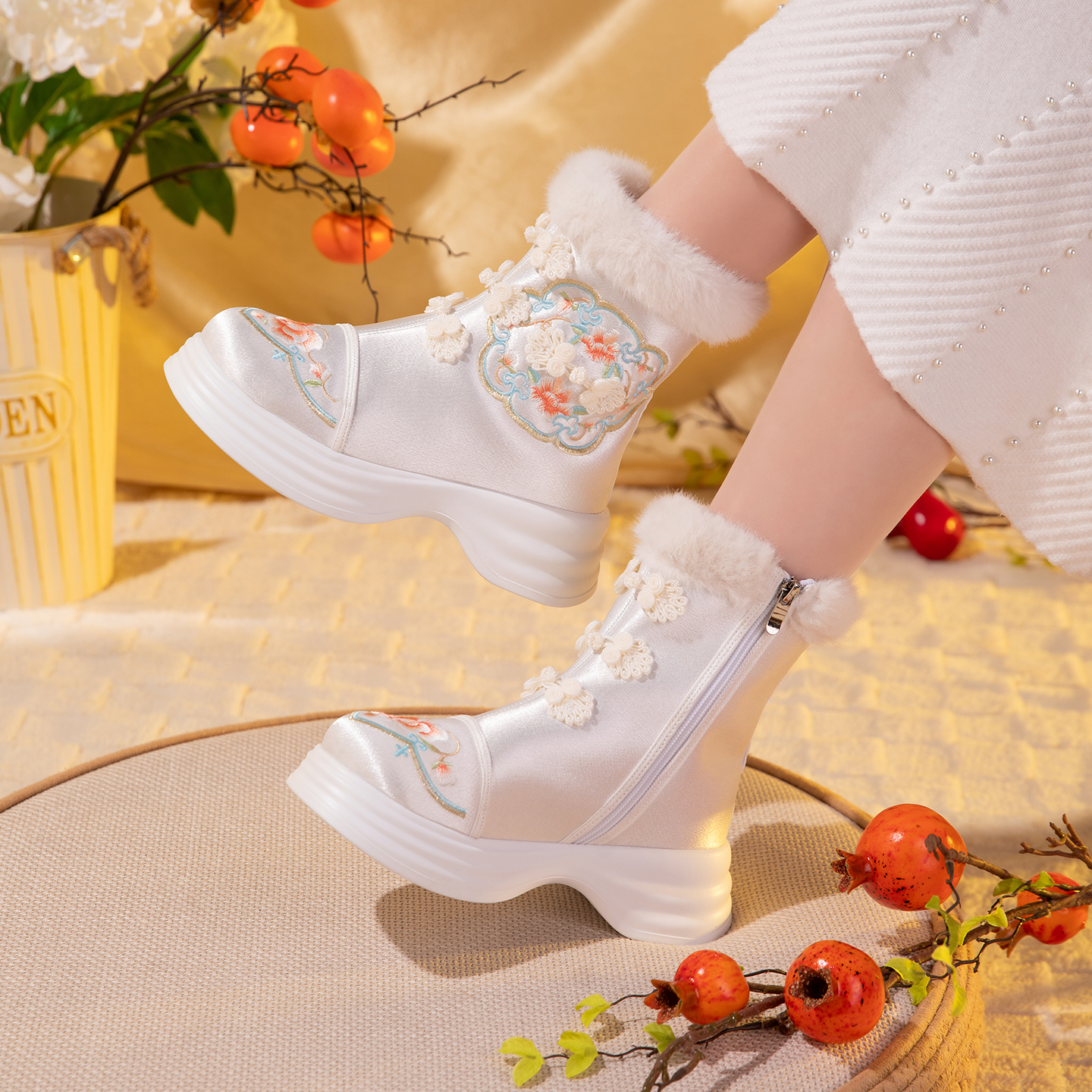 汉服靴 厚底加绒保暖棉靴民族风雪地靴配古装 新中式 国风靴子女冬季