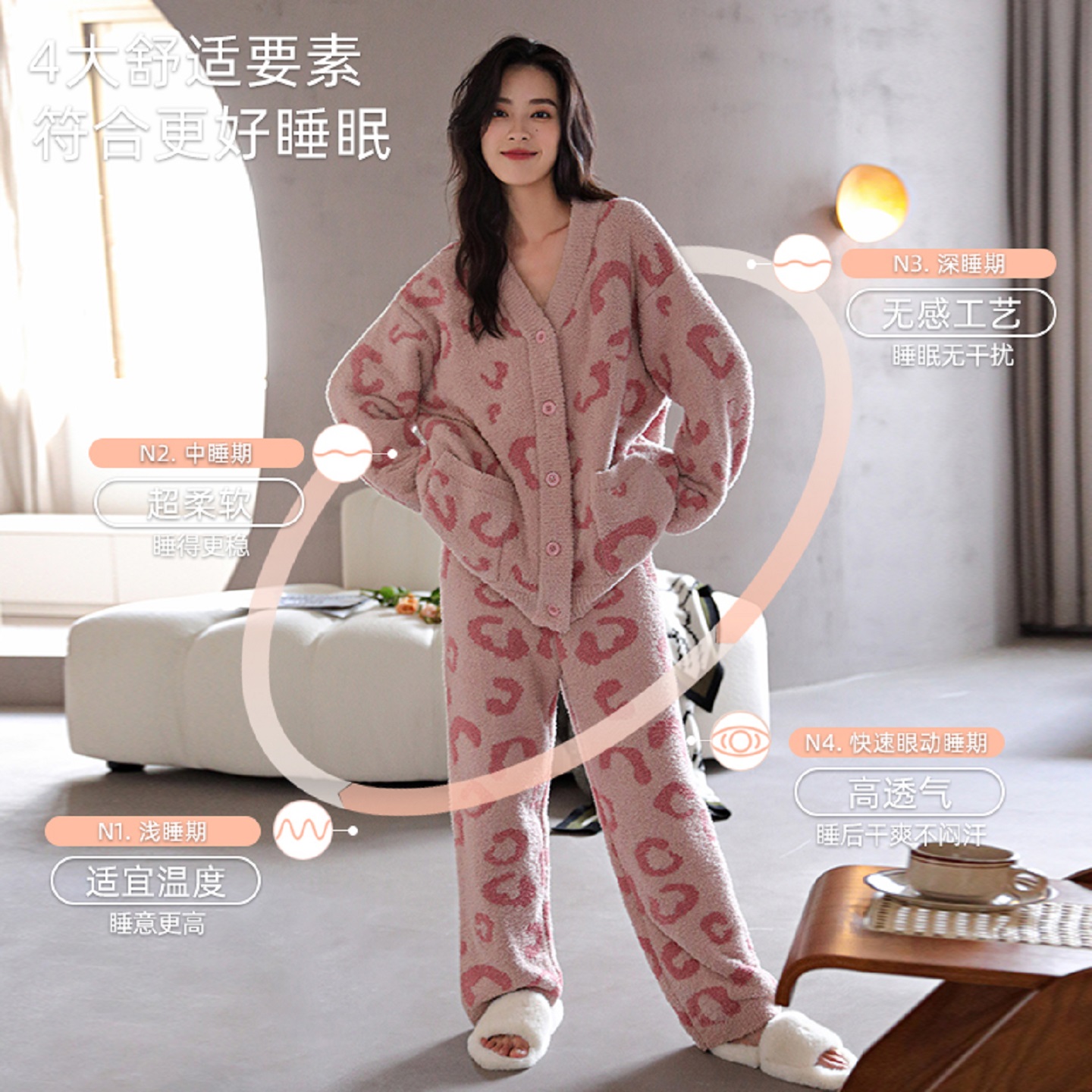 休闲甜美风冬天家居服女套装 开衫 半边绒保暖长袖 南极人睡衣女冬季