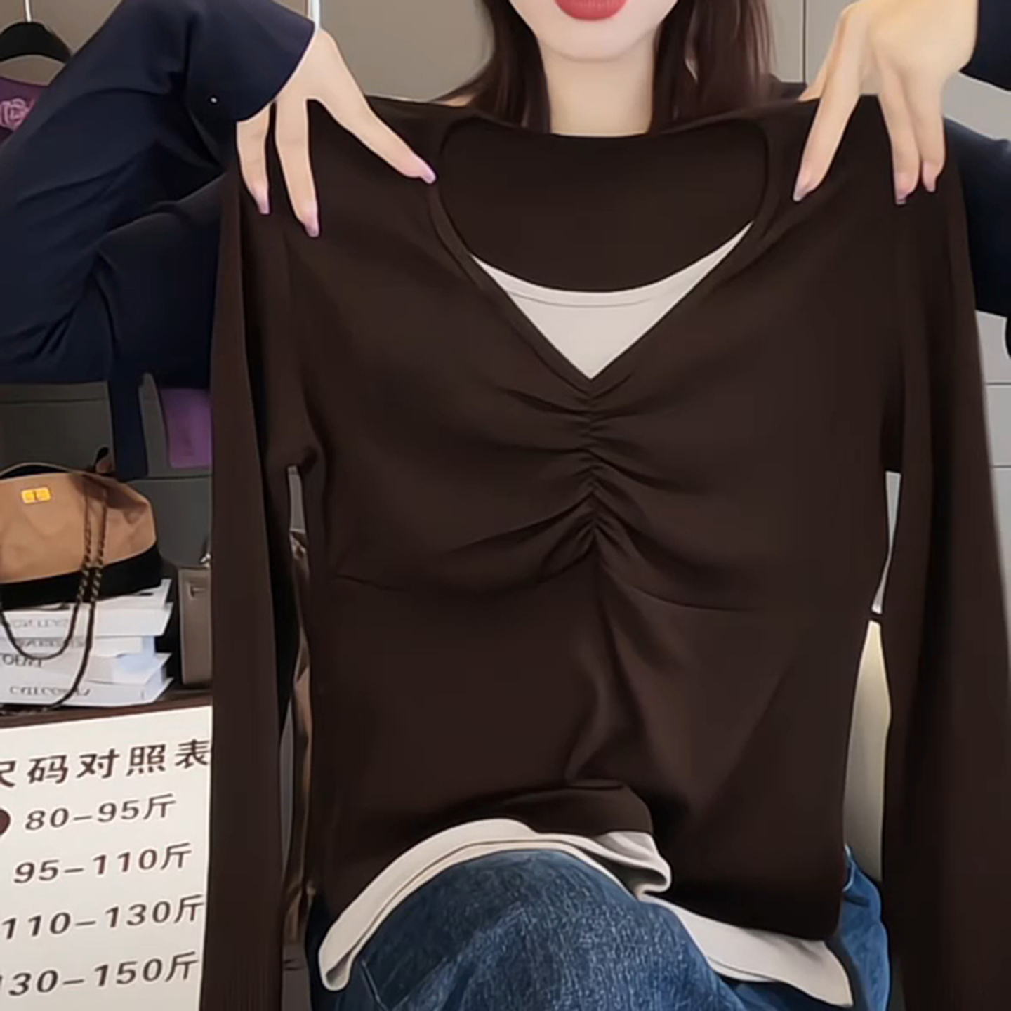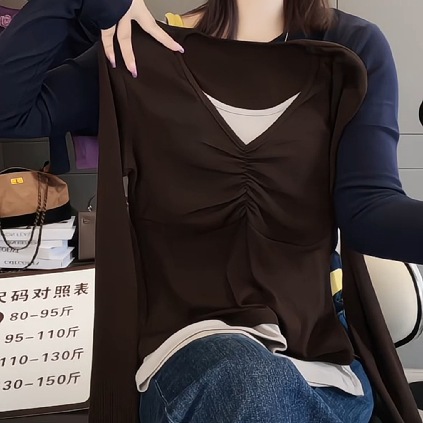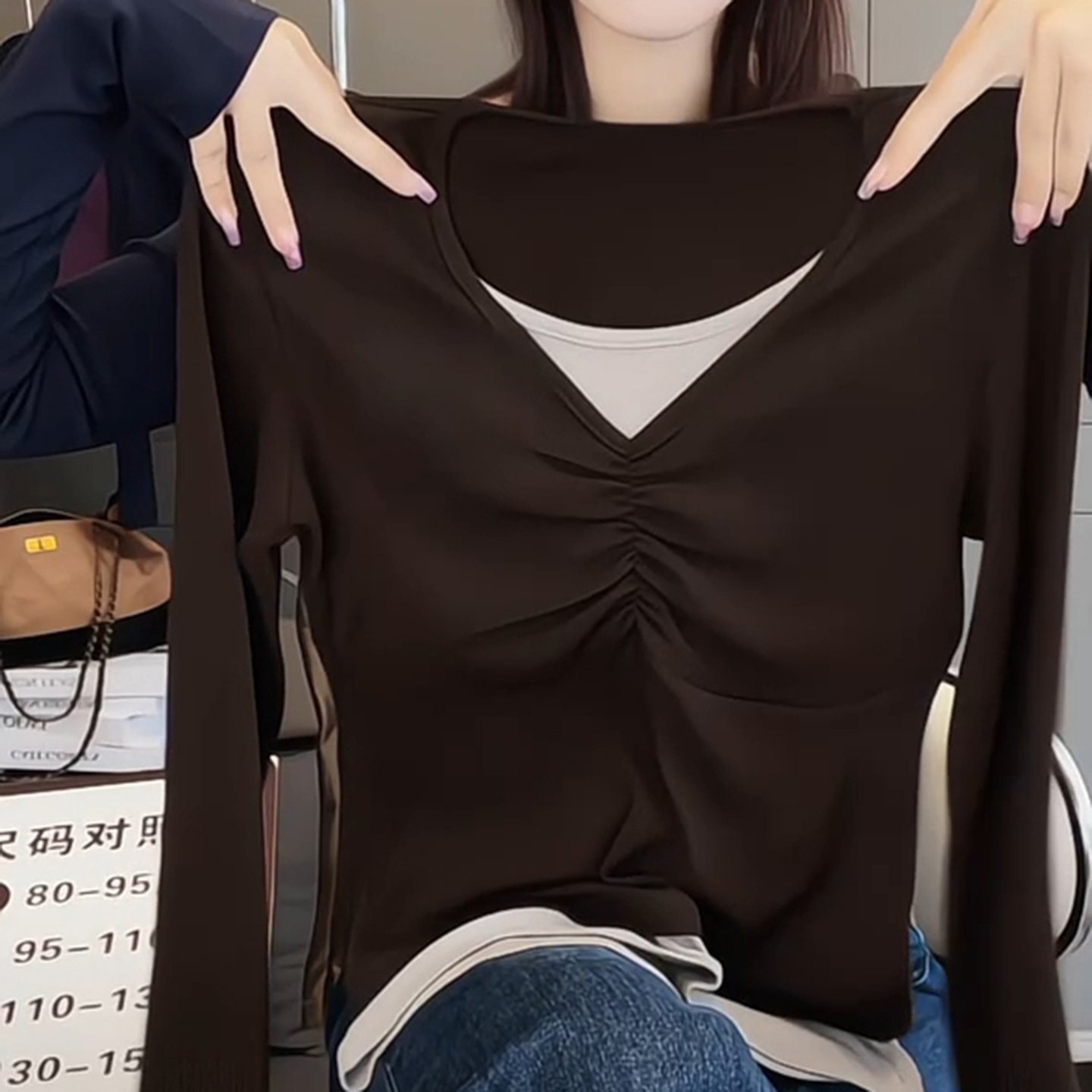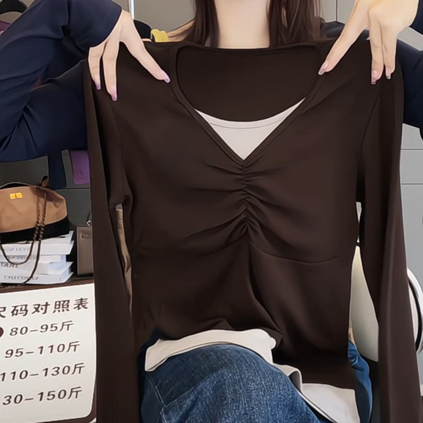 修身 新款 显瘦百搭上衣潮 T恤女2025秋季 韩系V领撞色拼接假两件长袖