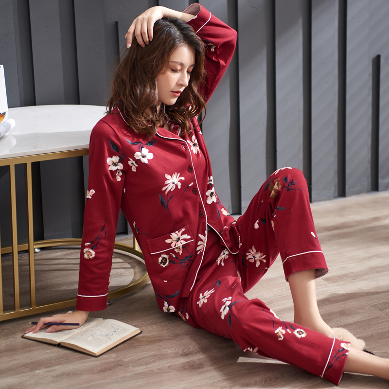 带胸垫防凸点全棉家居服套装 秋冬款 长袖 纯棉秋季 睡衣女士2025新款