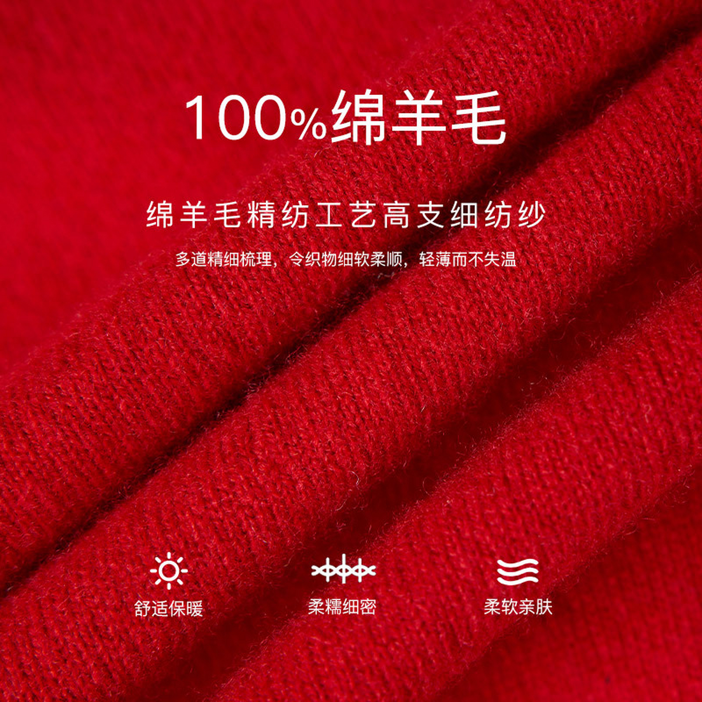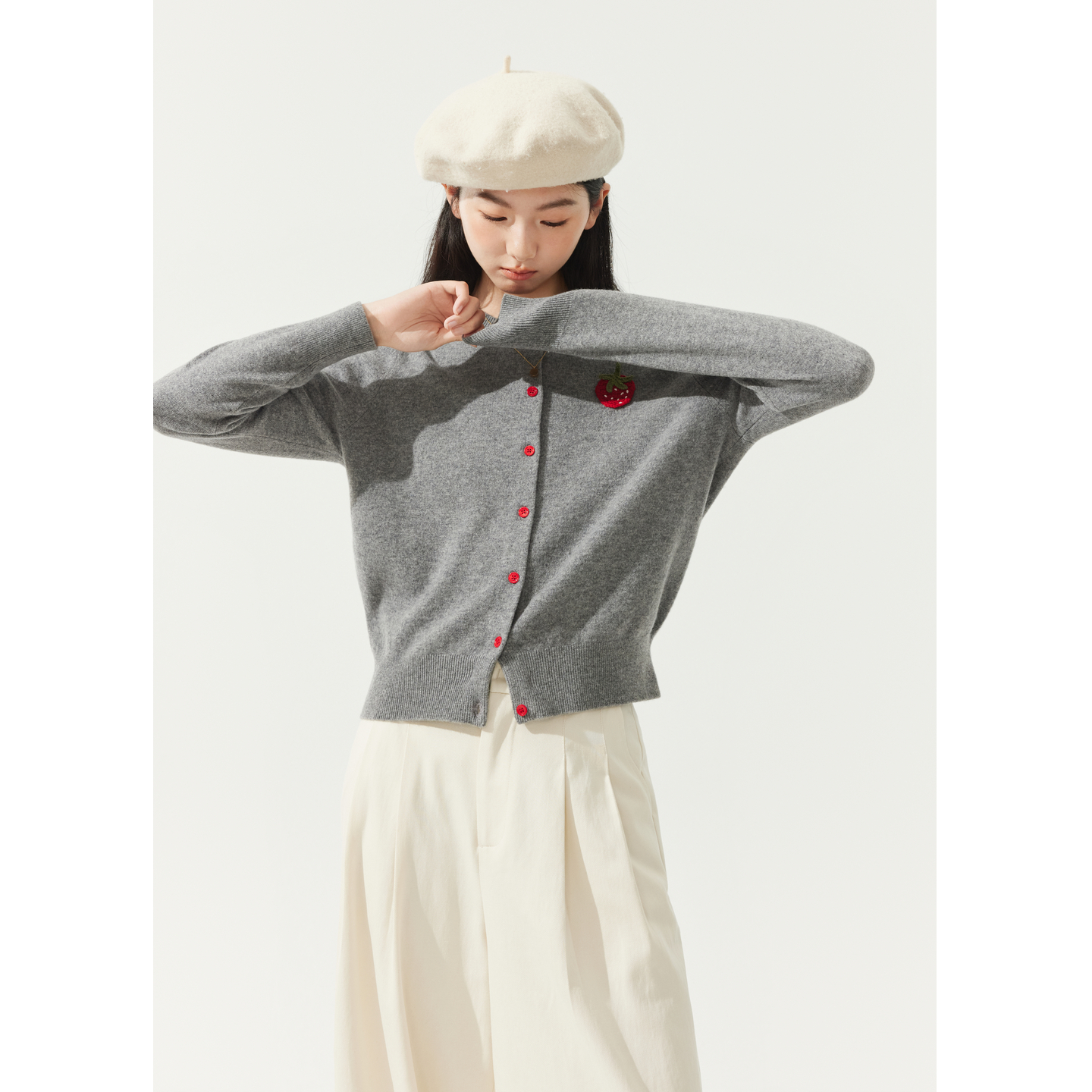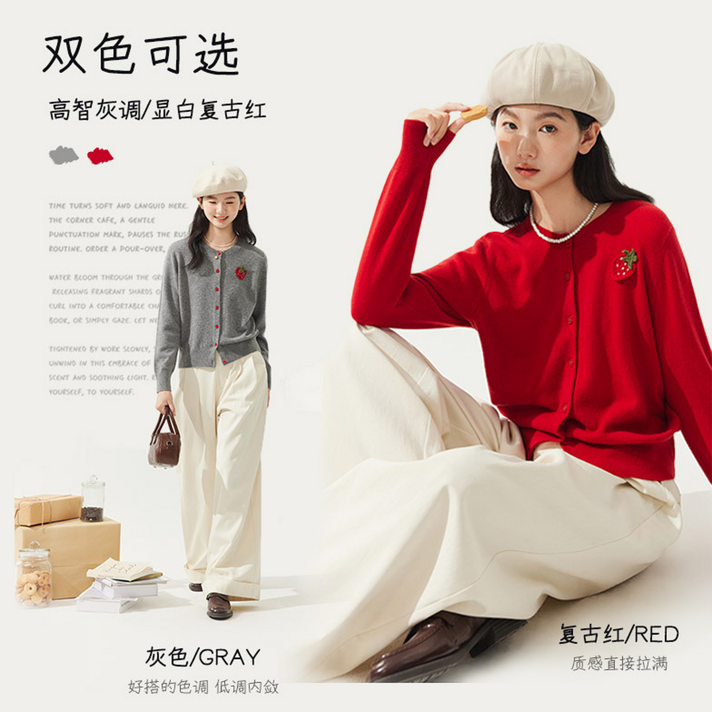 草莓刺绣宽松毛衣外套 新款 紫涵100%绵羊毛圆领针织开衫 女2025秋季