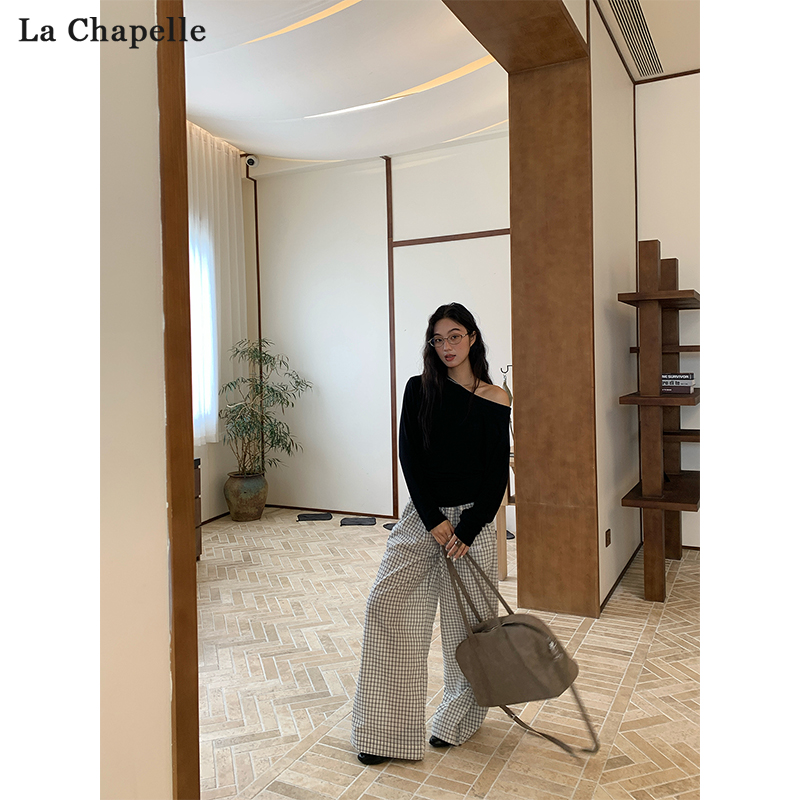 T恤女早秋设计感显瘦漏肩上衣 黑色天丝斜肩收腰长袖 Chapelle