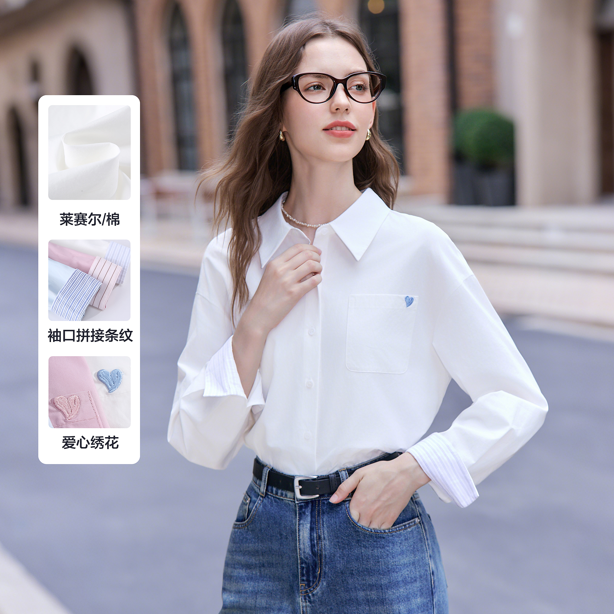 洋气百搭花卉刺绣白色衬衣长袖 新款 上衣 女2025年秋季 蓝色纯棉衬衫