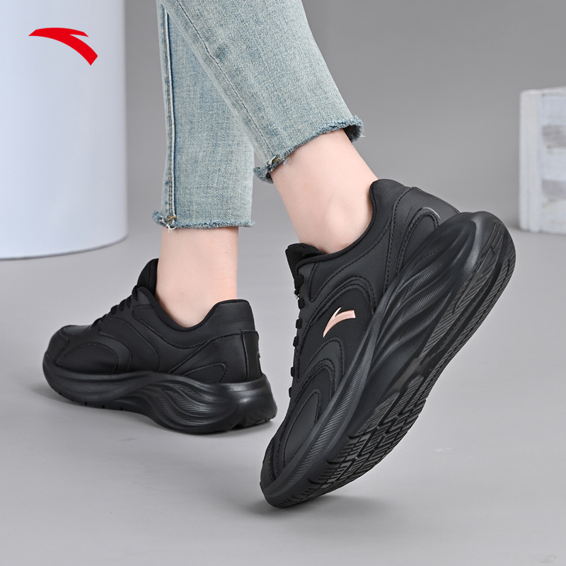 运动鞋 官方旗舰全黑皮面防水跑步鞋 女款 子2025新款 黑色鞋 安踏女鞋