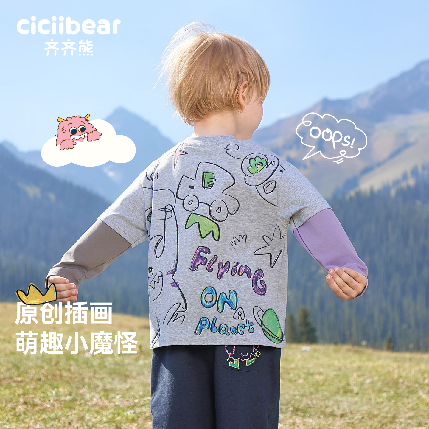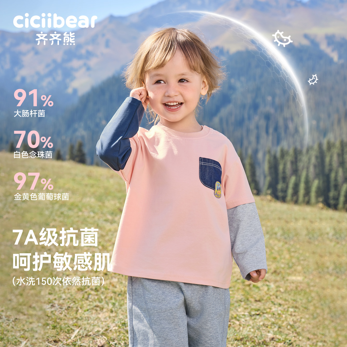 2025新款 t恤打底衫 齐齐熊男童T恤春秋宝宝假两件长袖 上衣 7A抗菌