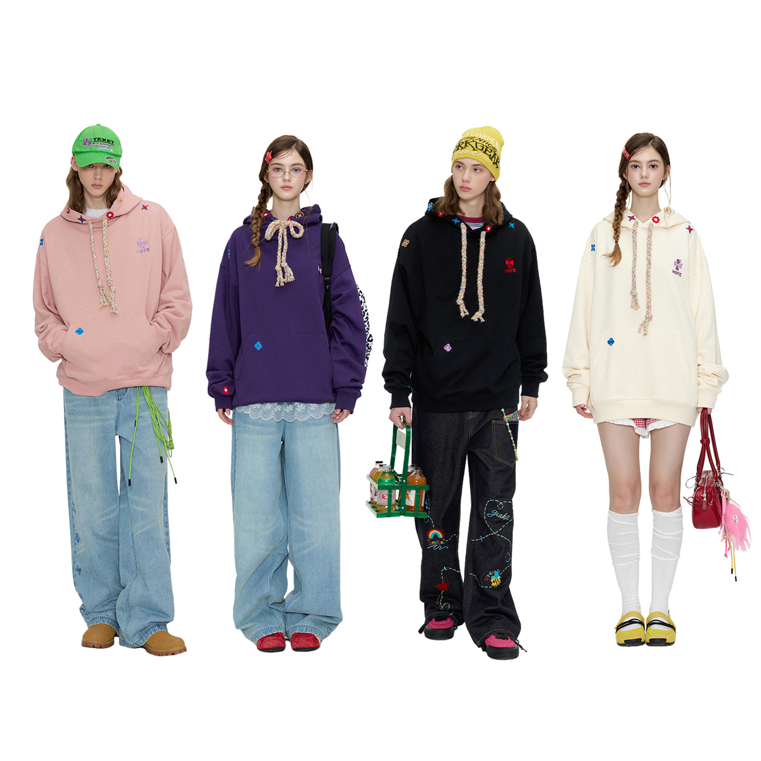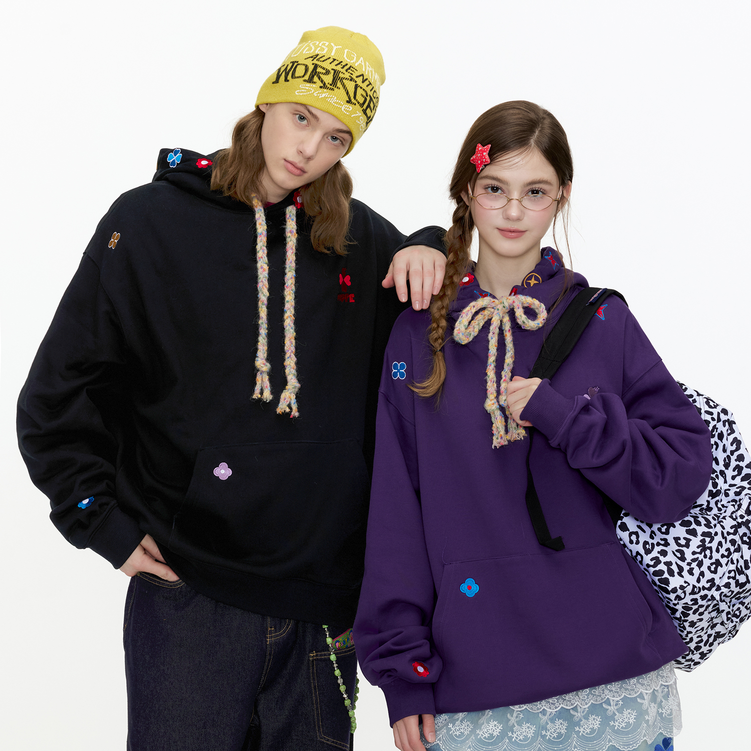 加绒落肩上衣 情侣花卉刺绣帽衫 GUUKA潮牌美式 重磅连帽卫衣男纯棉