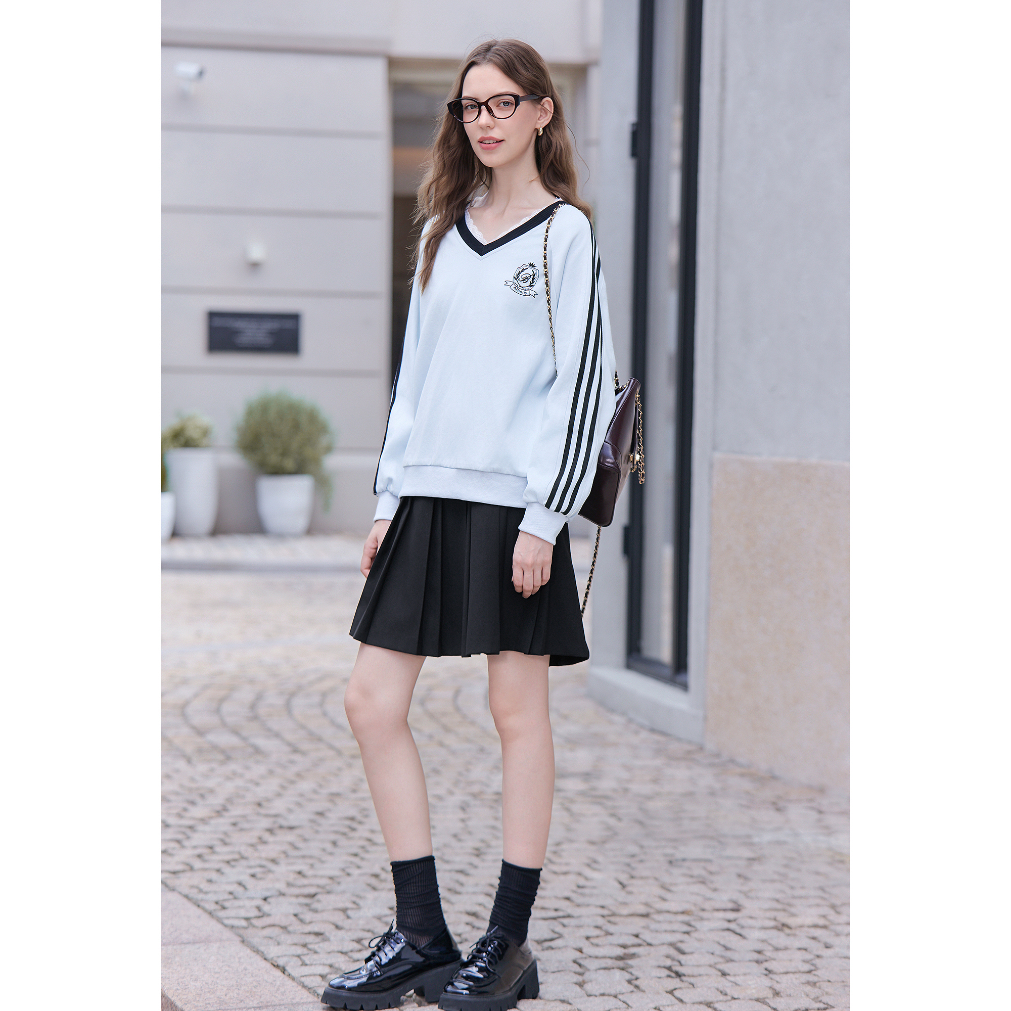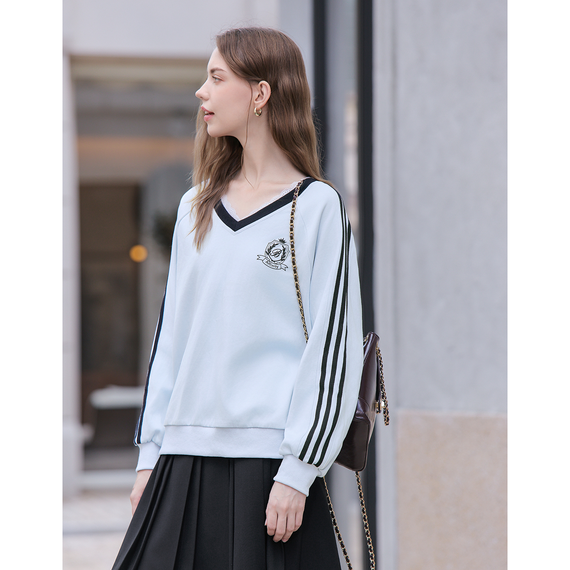 betu百图撞色蕾丝花边V领卫衣女套头2025年秋季 运动风上衣 新款