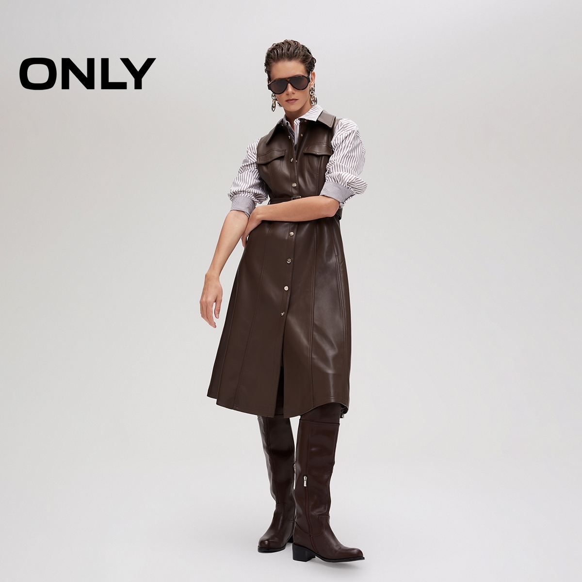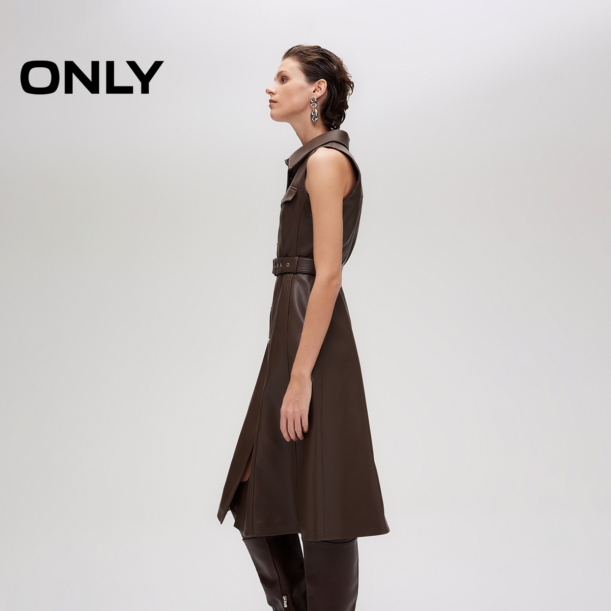 中长连衣裙女 「琥珀流光风」PU复古翻领收腰无袖 ONLY2025秋季 新款