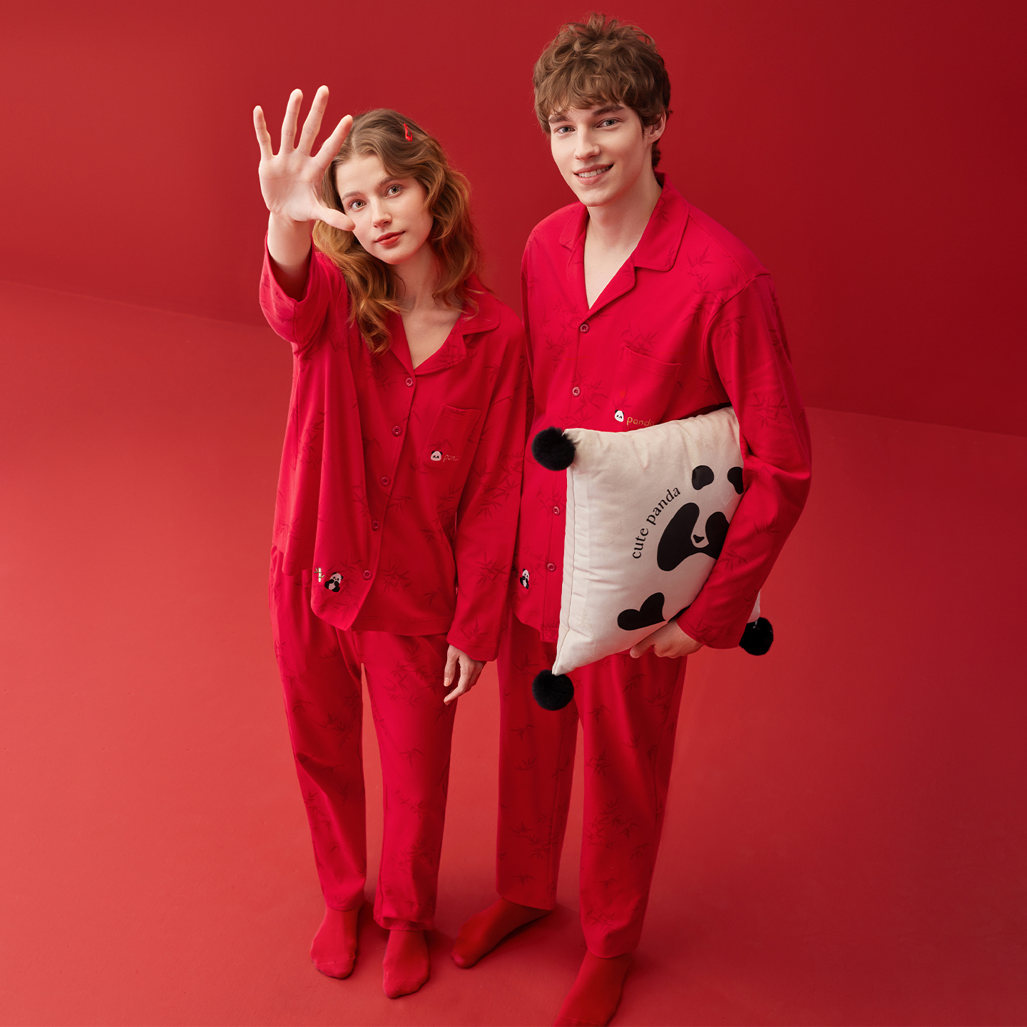 抗静电套装 长袖 红色本命年结婚家居服 纯棉开衫 芬腾情侣睡衣春秋季