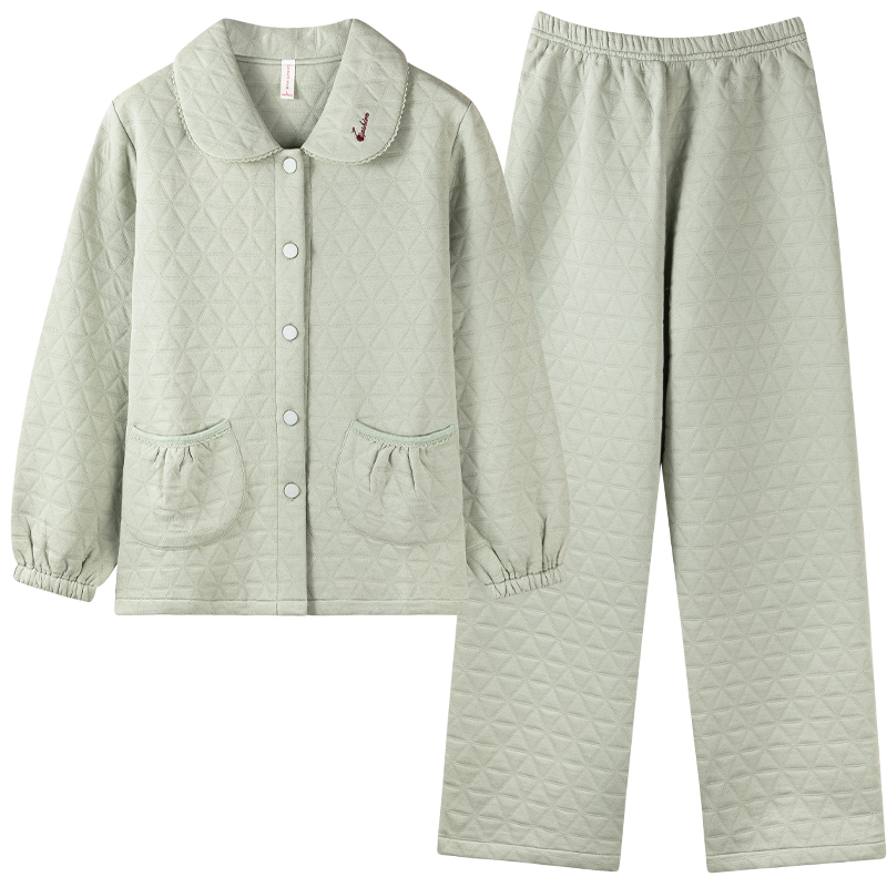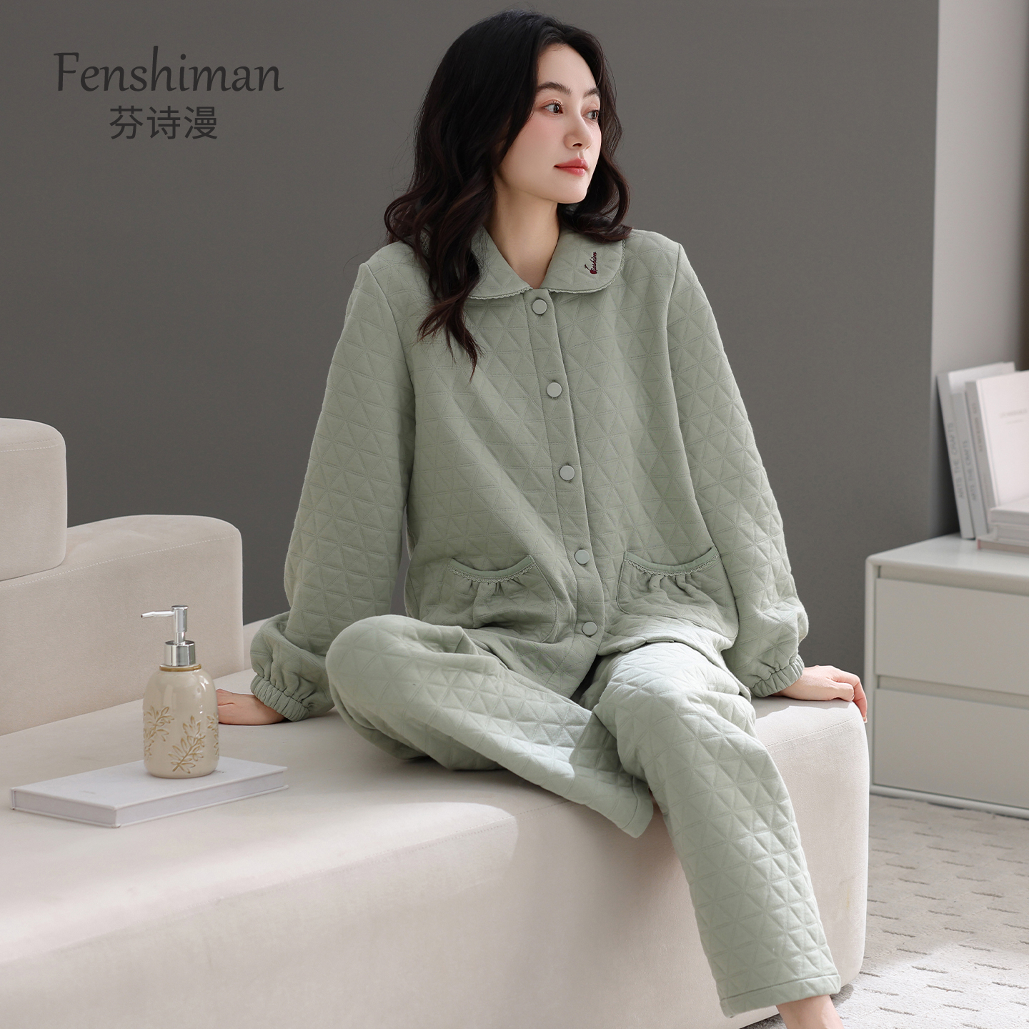 薄款 睡衣女士春秋款 空气棉夹层秋冬季 女款 夹棉家居服 加厚纯棉长袖