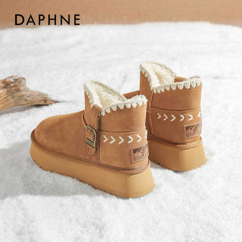 勾花面包短靴子 真皮加绒保暖棉鞋 达芙妮厚底雪地靴女2025冬季 新款