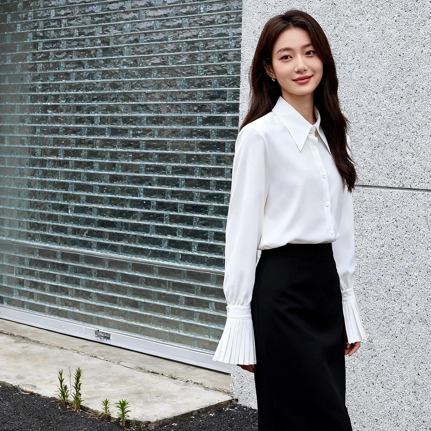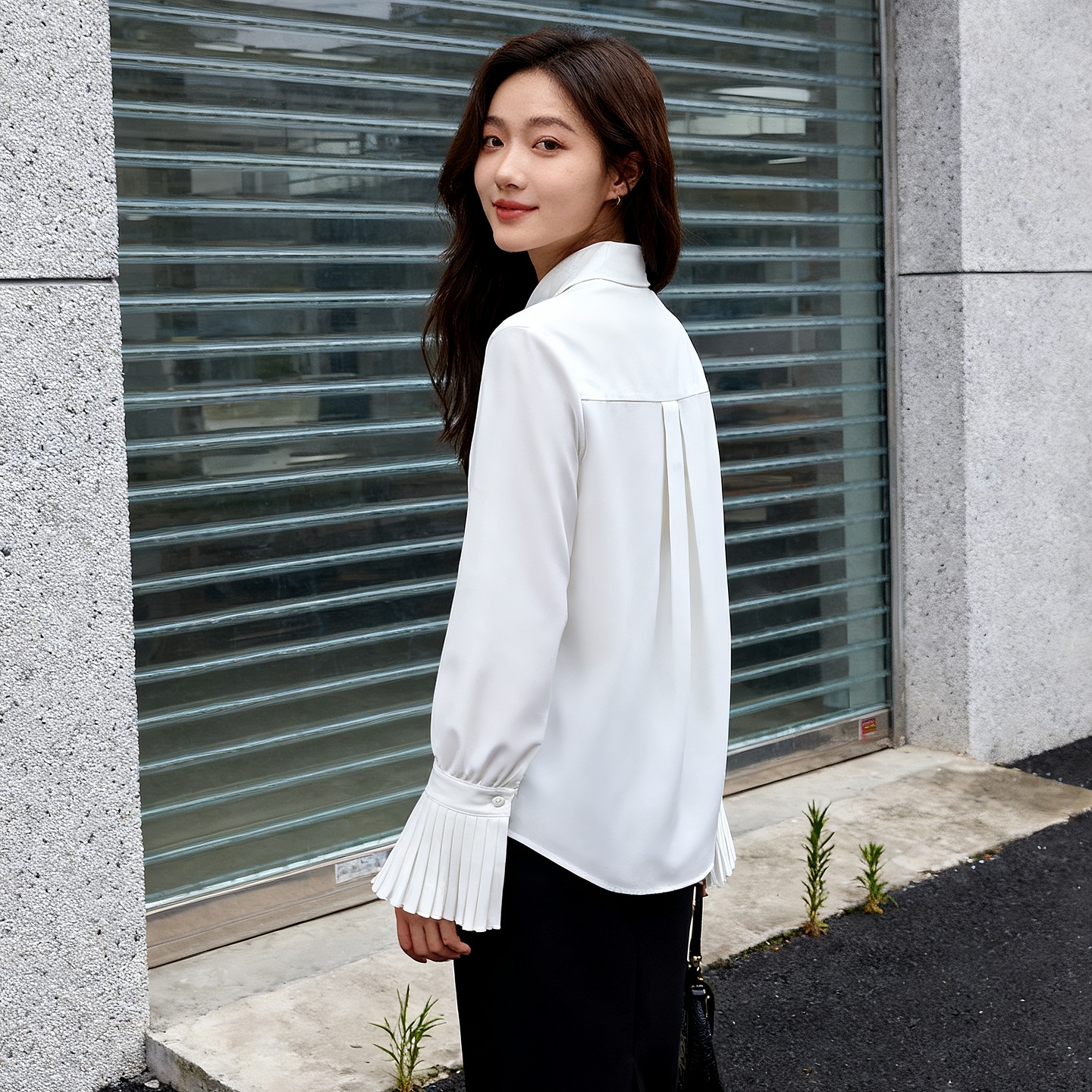 褶皱袖 Basic 2025秋季 百家好简约白色衬衫 口设计翻领上衣女 House