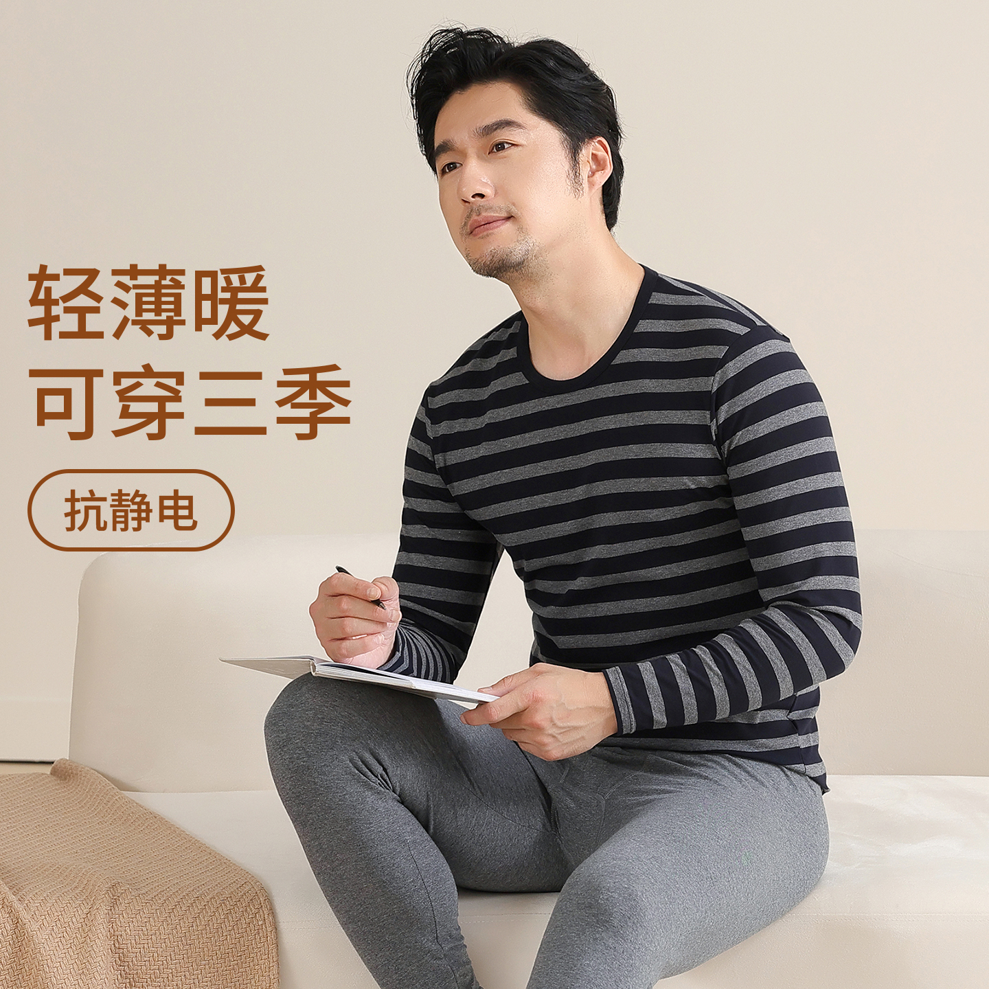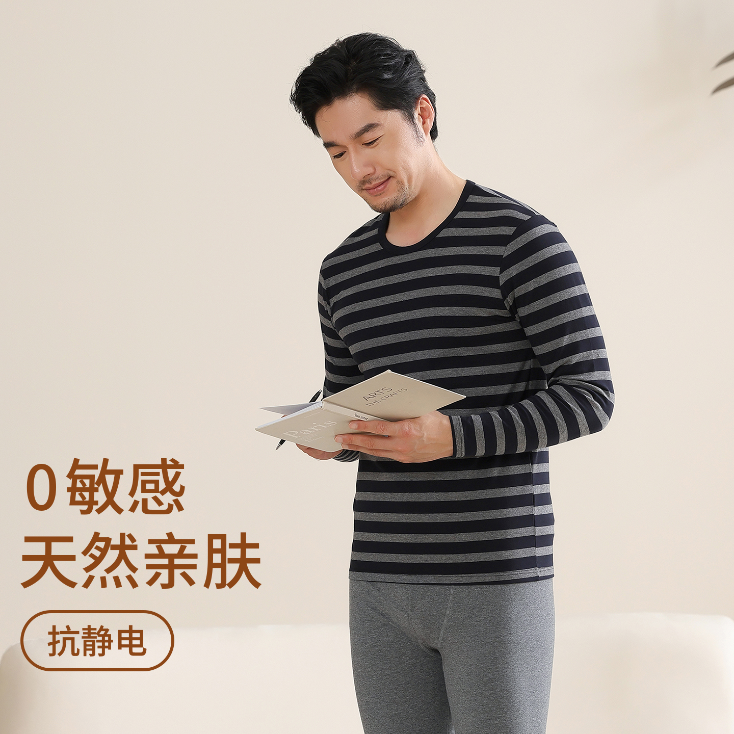 棉毛衫 新一步条纹男士 秋衣秋裤 内穿打底衫 印花保暖内衣中年爸爸款