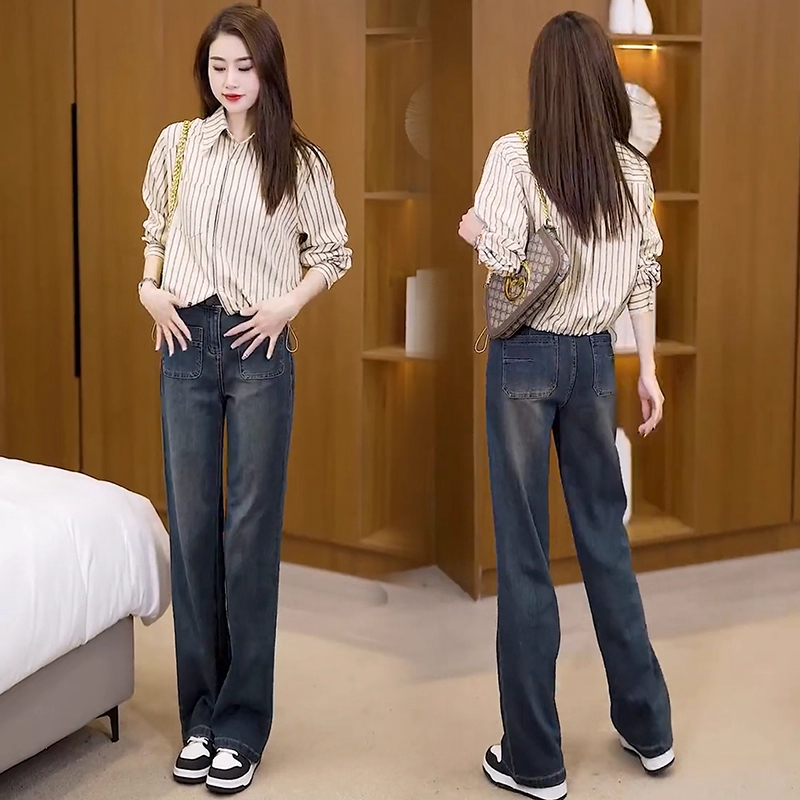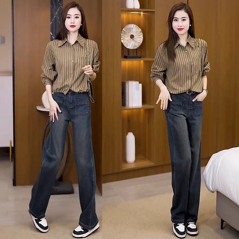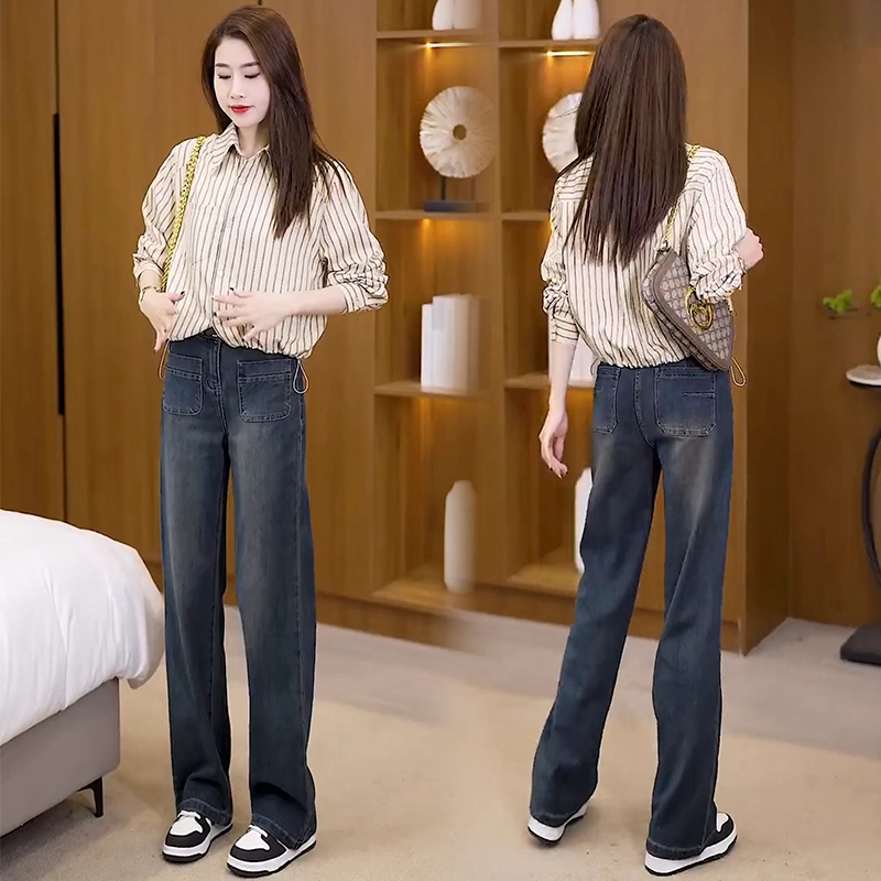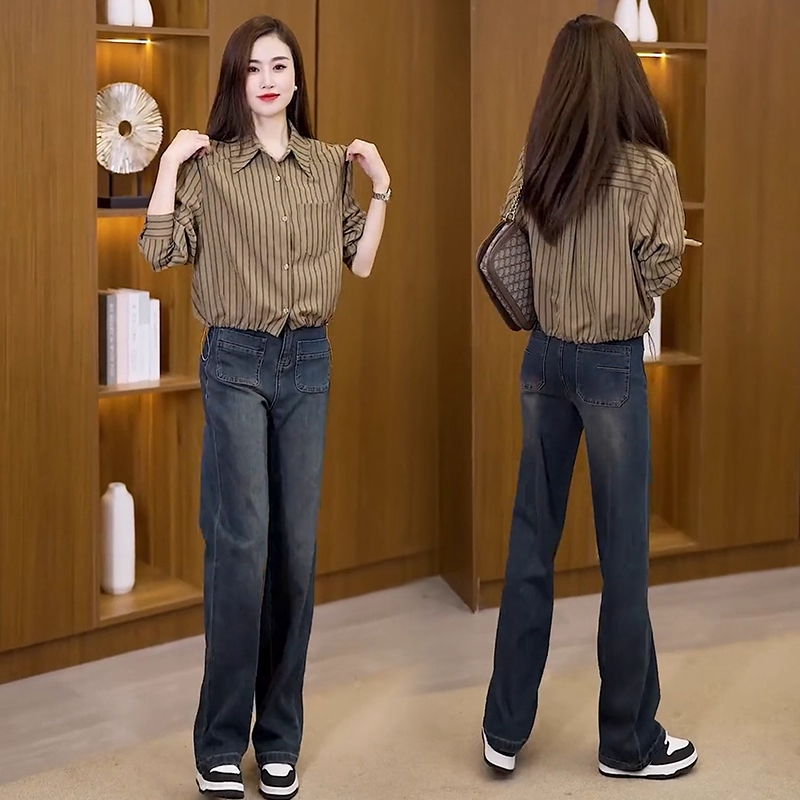 穿搭阔腿牛仔直筒裤 爆款 洋气条纹衬衫 女2025春装 子两件套 牛仔套装