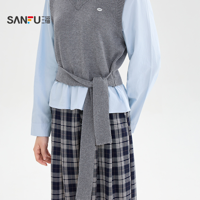 假两件上衣女装 设计感下摆绑带衬衫 510222 秋季 三福毛衣女2025新款
