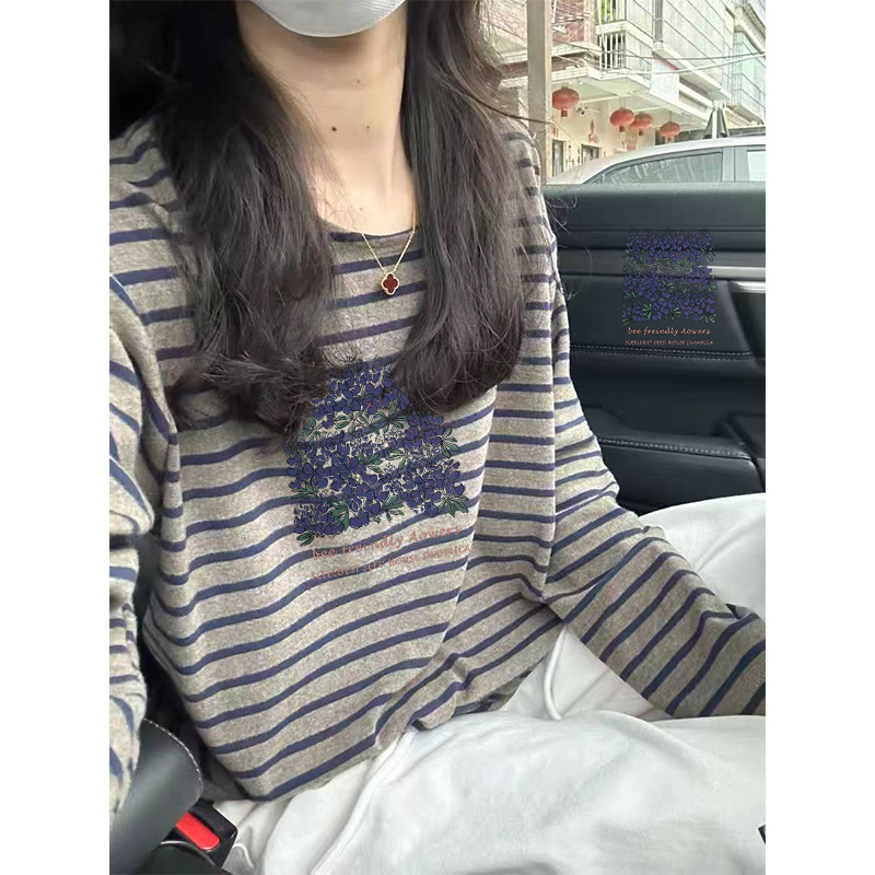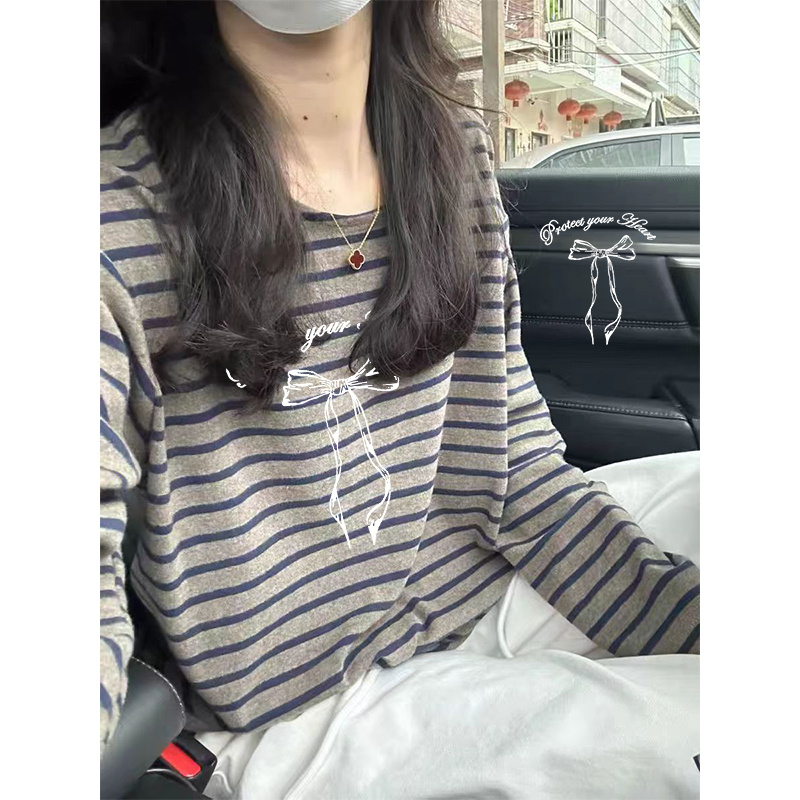 胖MM宽松遮肚长袖 女秋冬2025新爆款 t恤上衣 条纹拼接打底衫 常规款