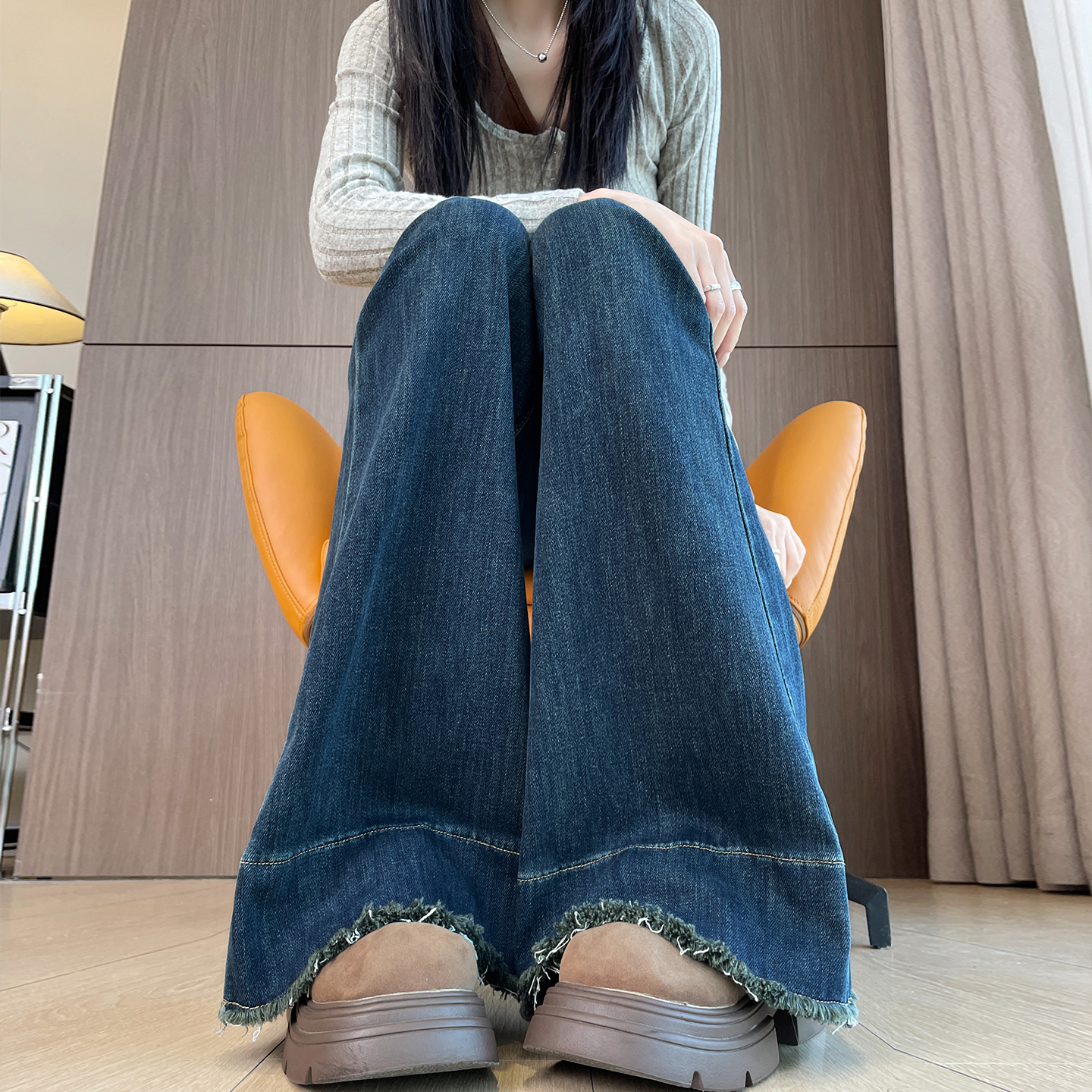 CUBIC复古时髦慵懒弯刀廓形中低腰原牛色阔腿牛仔裤
