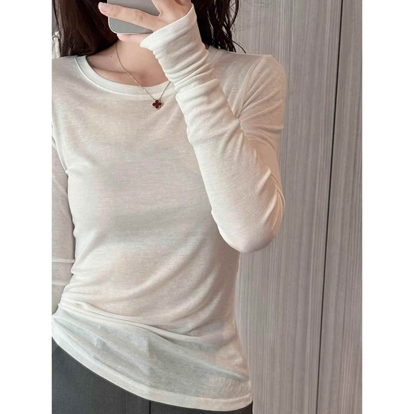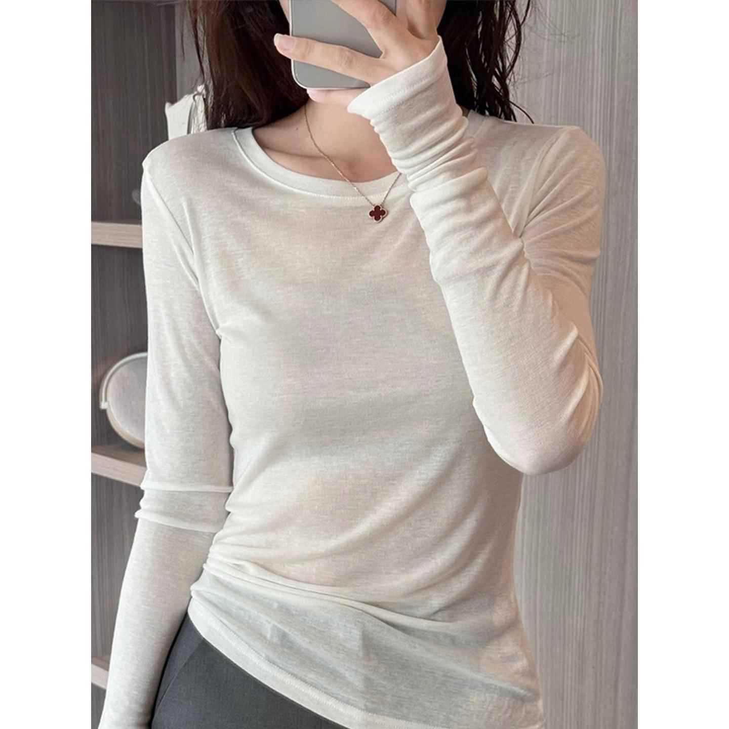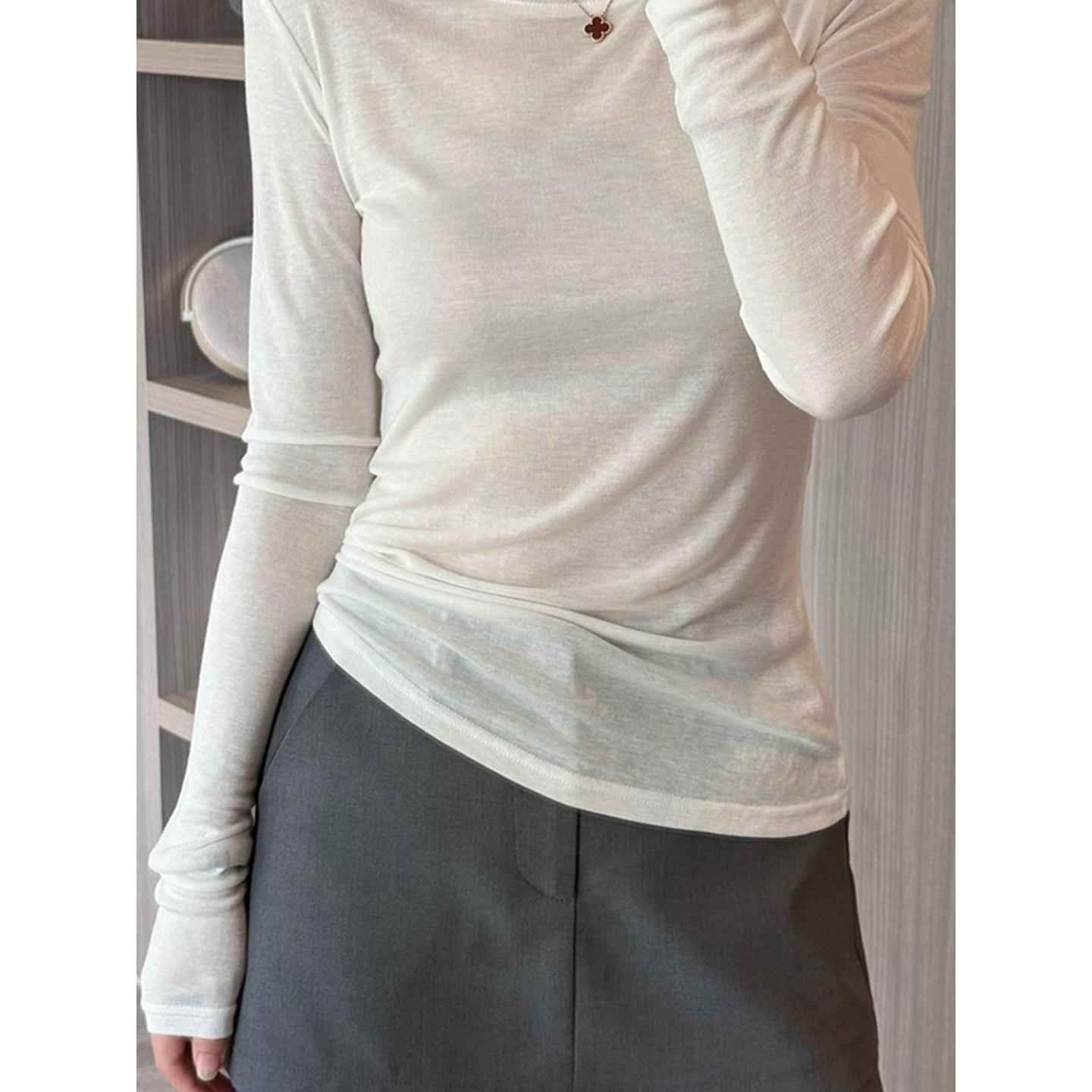 漂亮上衣1022e 显瘦微透打底衫 白色正肩长袖 T恤女秋冬内搭修身