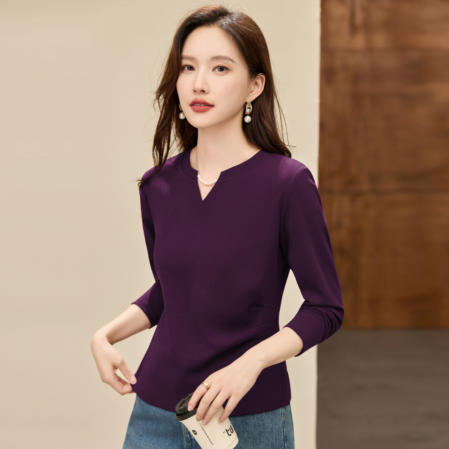 灰色上衣洋气减龄薄打底衫 正肩v领长袖 女装 早秋爆款 t恤女2025新款
