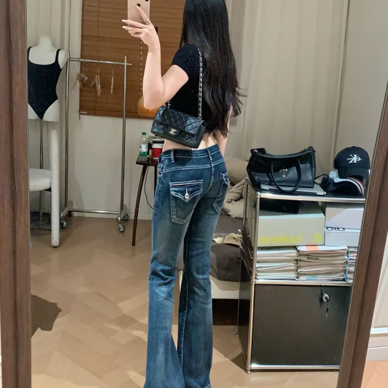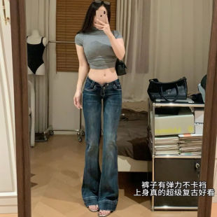女 显瘦复古百搭拖地长裤 镜中窥梦低腰水洗蓝高弹微喇牛仔裤 修身