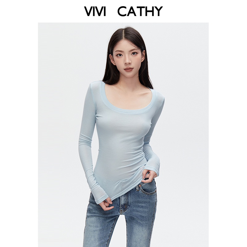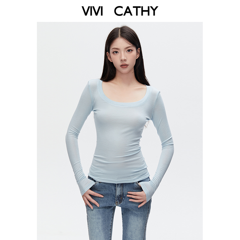 辣妹修身 打底衫 显瘦上衣 T恤女春秋内搭短款 设计感小众正肩V领长袖