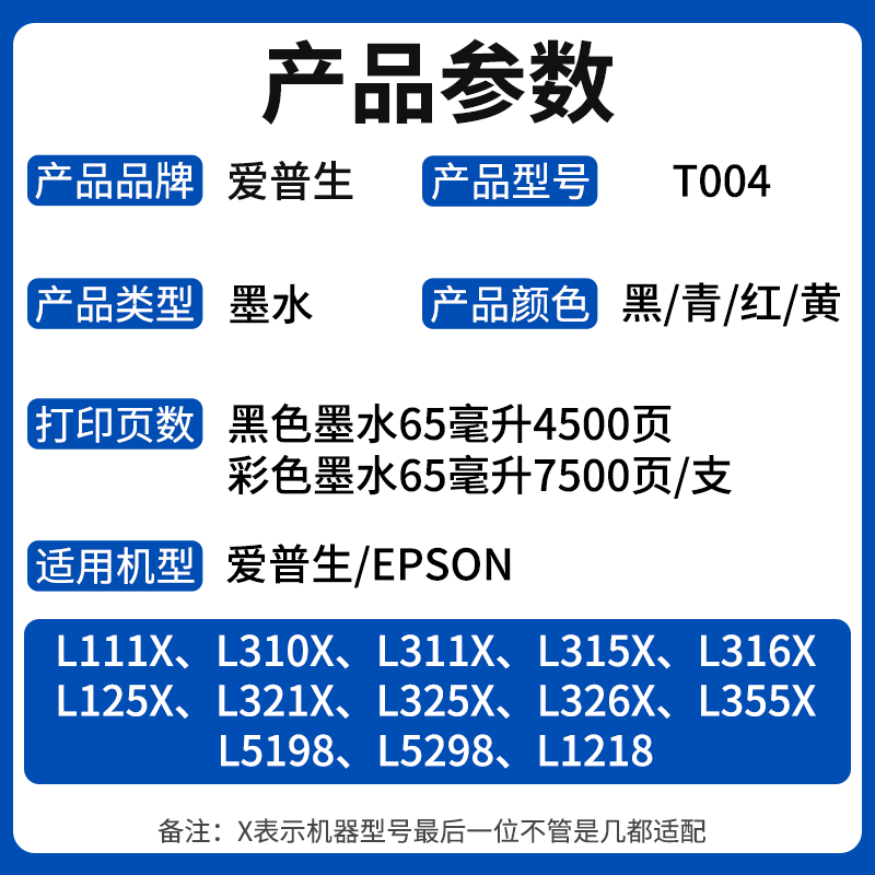 L3256 喷墨打印 L3115 墨水适用L3251 L3253 3116 L326X L3258 3119 爱普生Epson004原装 L1119 3118 L3108