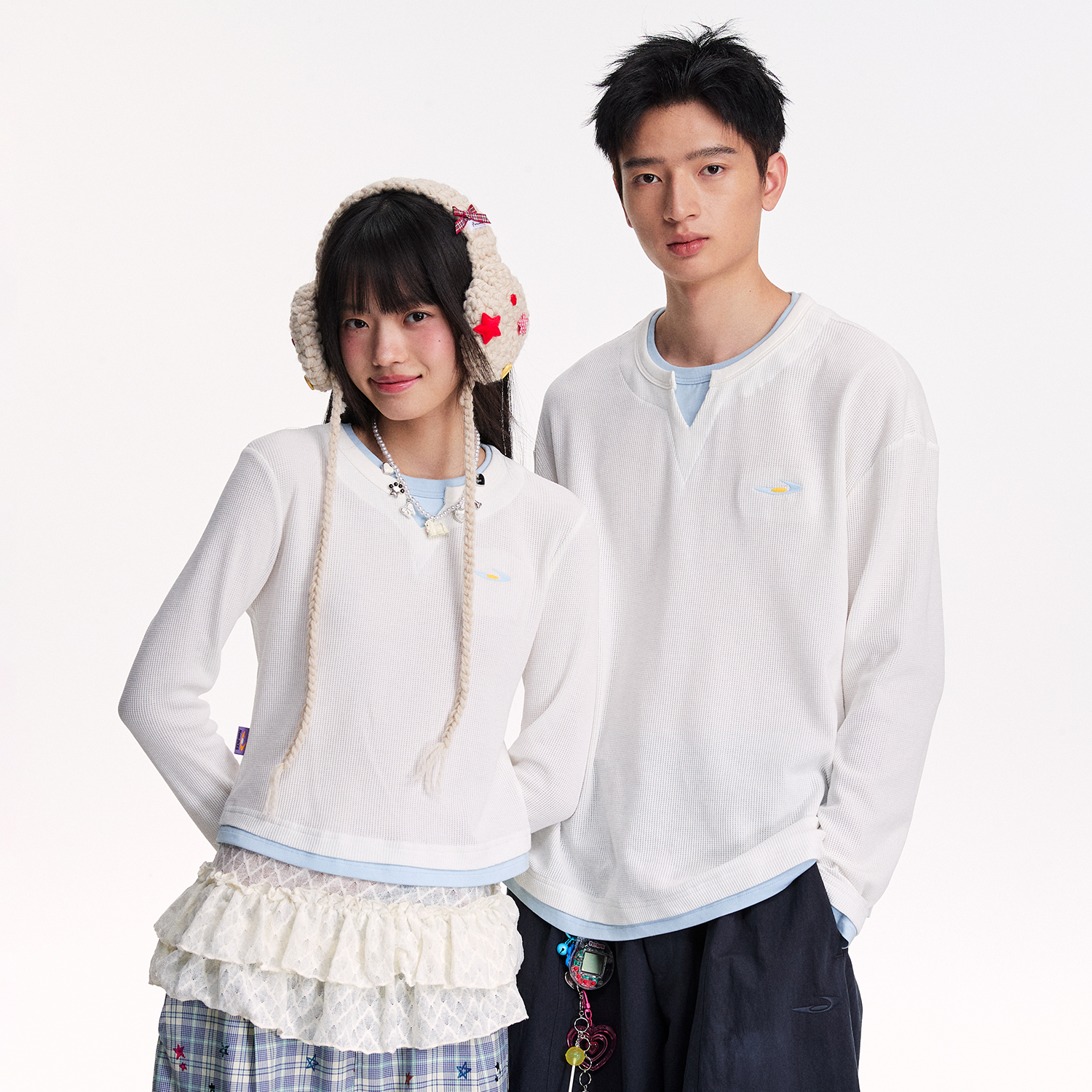 休闲百搭情侣装 江南先生NewJNXS华夫格肌理撞色假两件长袖 T恤秋季