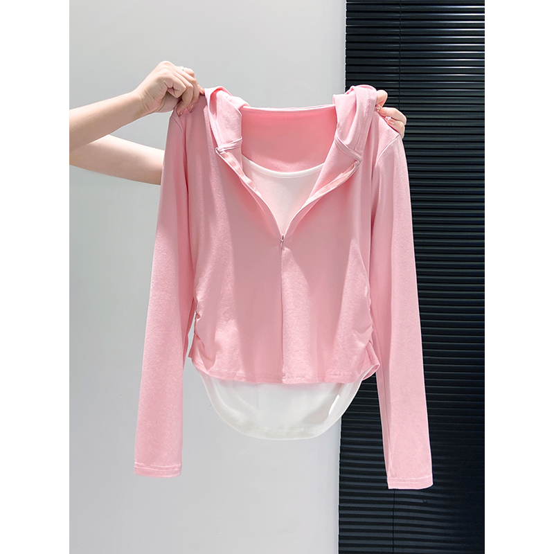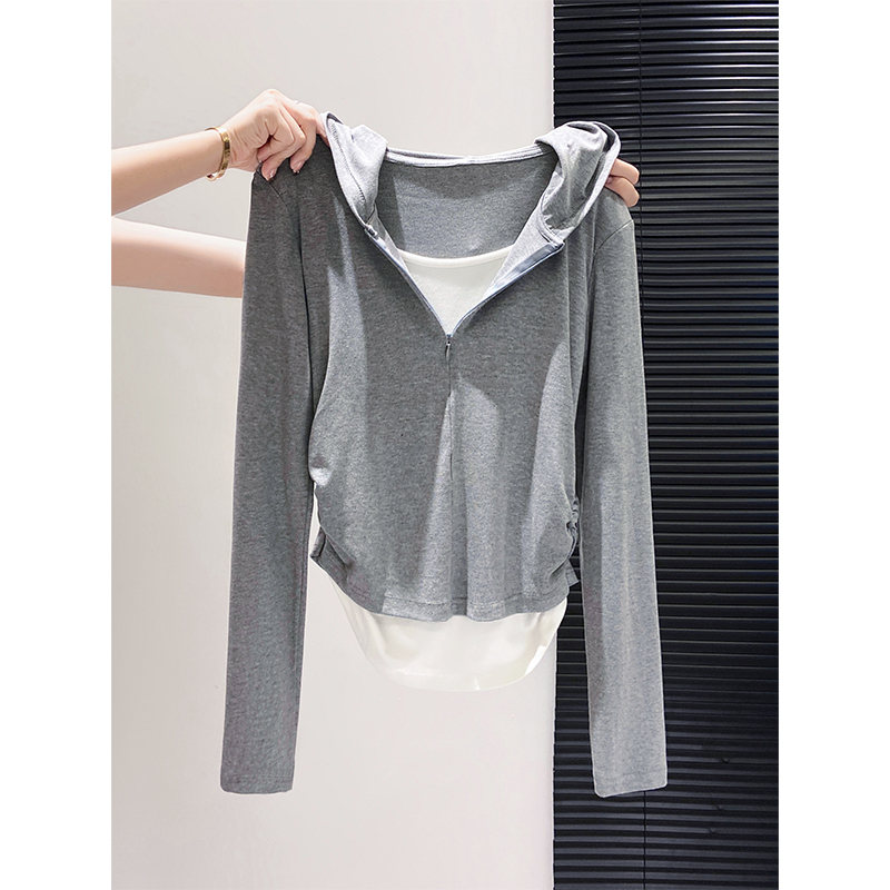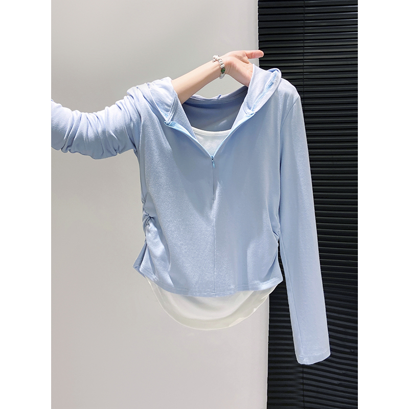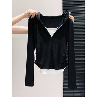 显瘦褶皱打底短款 修身 上衣 t恤女2025早秋新款 拼接连帽假两件长袖