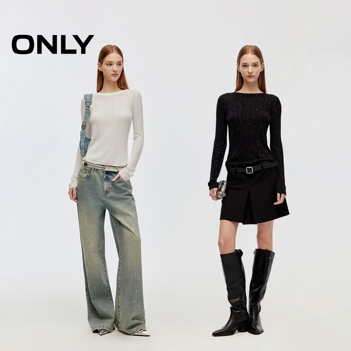 针织衫 ONLY2025秋季 亮片长袖 圆领不规则坑条轻盈舒适修身 女 新款